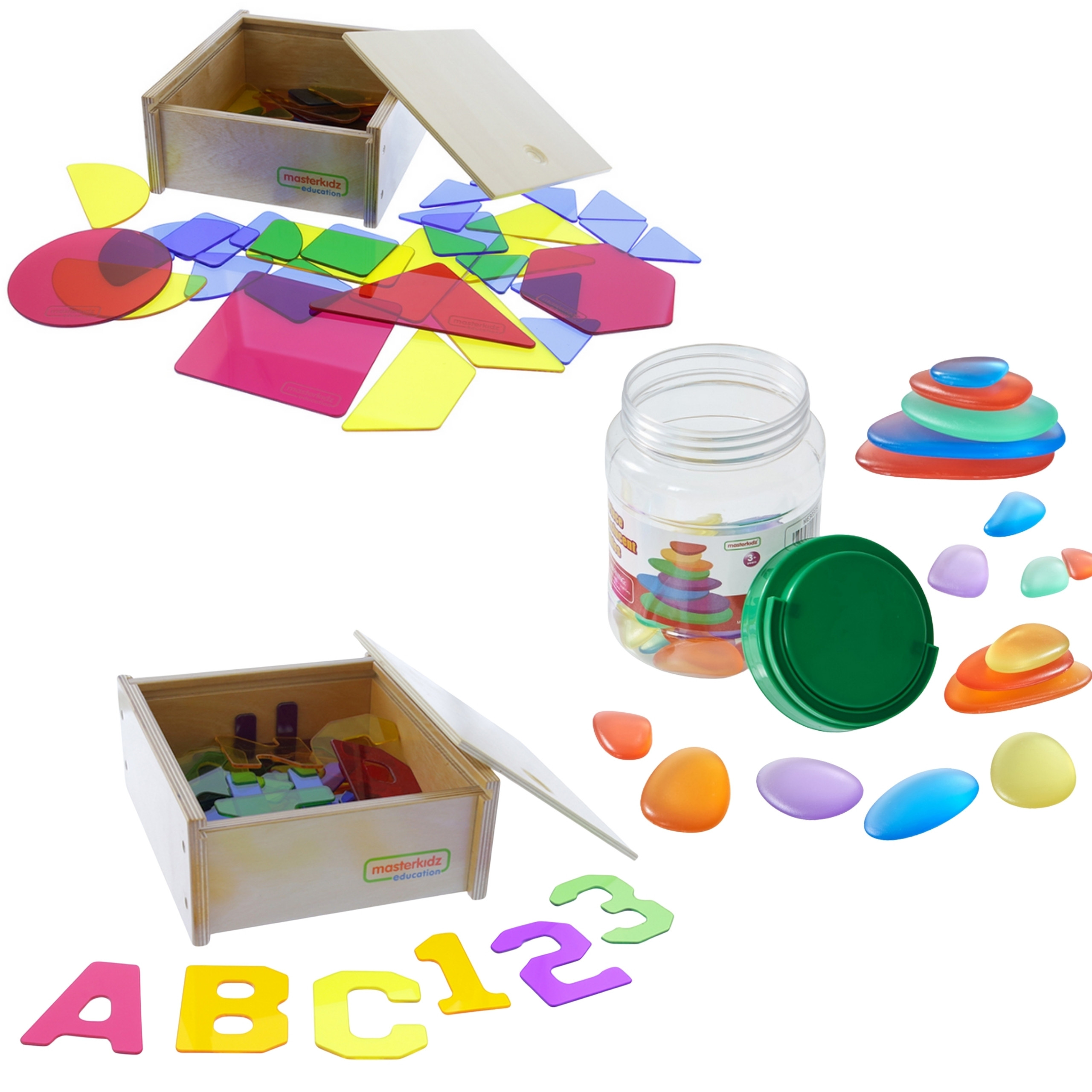 Balta šviesa ypač įspūdingai prasiskverbia per įvairias medžiagas — lapus, popierių, smėlį, akmenėlius, vandenį — sukurdama ryškius, aiškius ir estetiškus efektus. Komplekte esantys spalvoti akmenėliai, pusiau permatomos didelės geometrinės figūros ir skaidrūs Montessori skaičiai bei raidės leidžia kurti raštus, kompozicijas ir mokytis per šviesą.