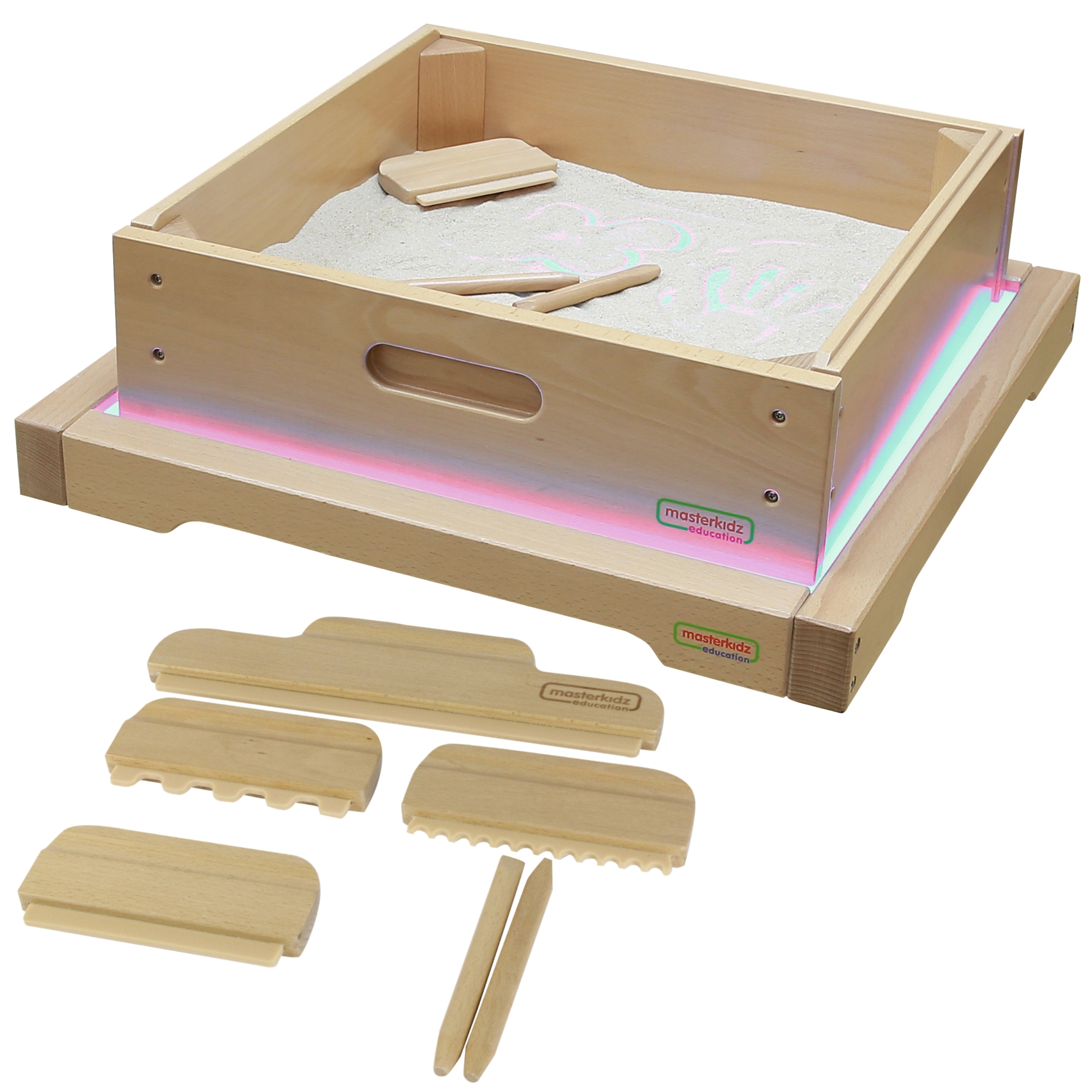 Komplekte esanti smėlio dėžutė ir spalvoti akmenėliai dar labiau praplečia veiklų spektrą, paversdami šią šviesos dėžę tikra sensorine ir kūrybine laboratorija.
