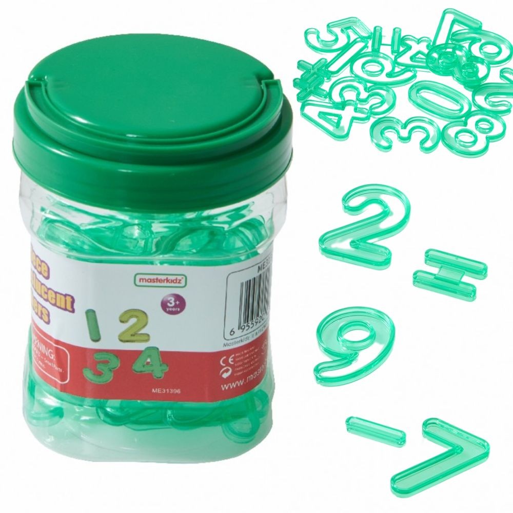 Skaičiai pagaminti iš žalios, permatomos medžiagos, kuri „gaudo“ šviesą – idealu darbui su šviesos plokštėmis (light tables)