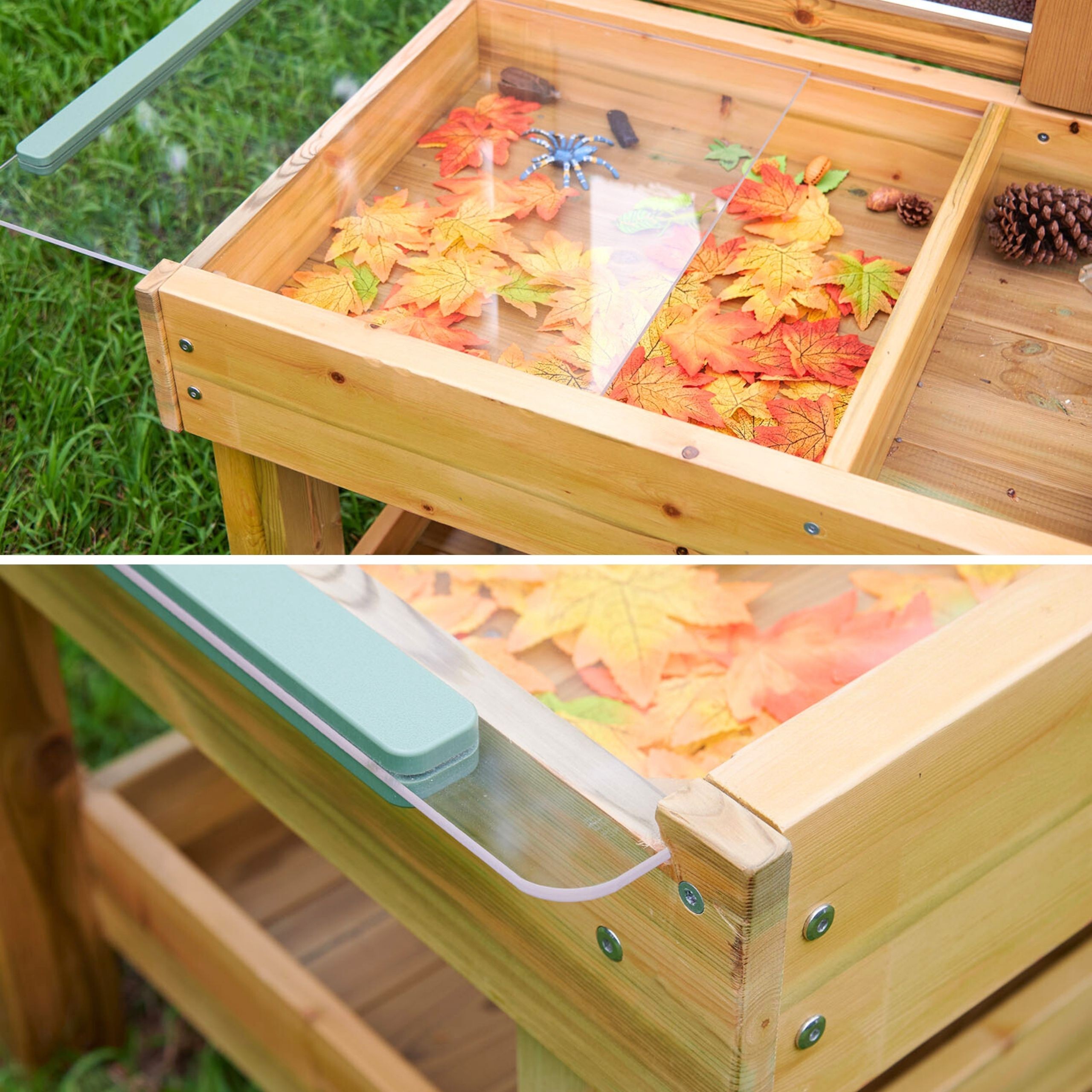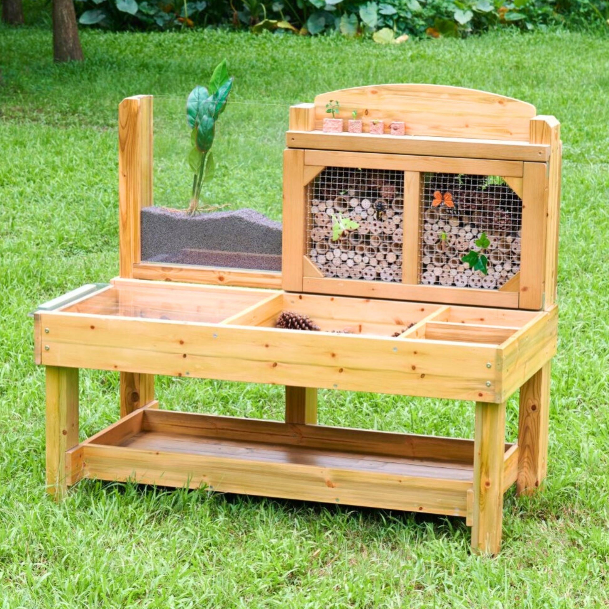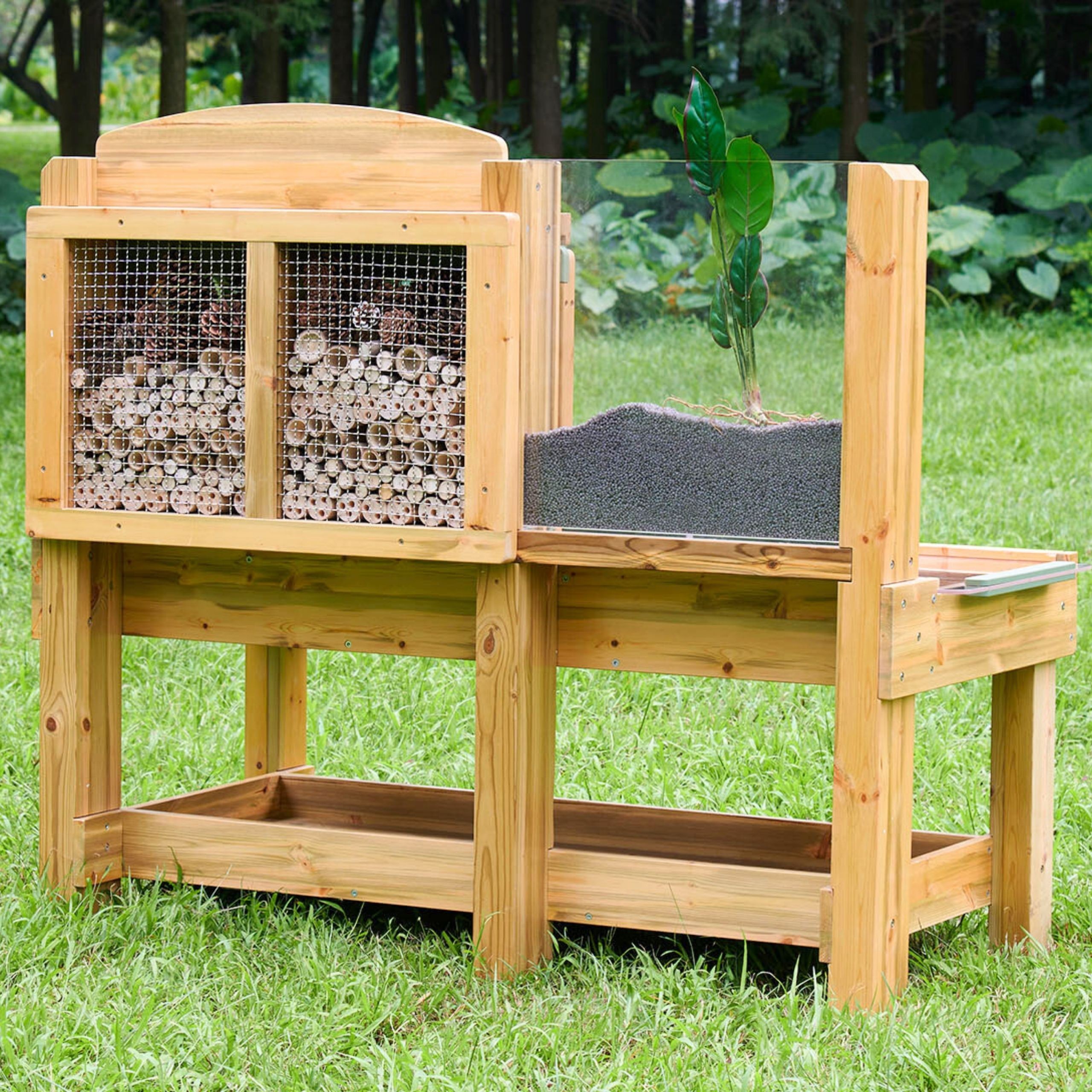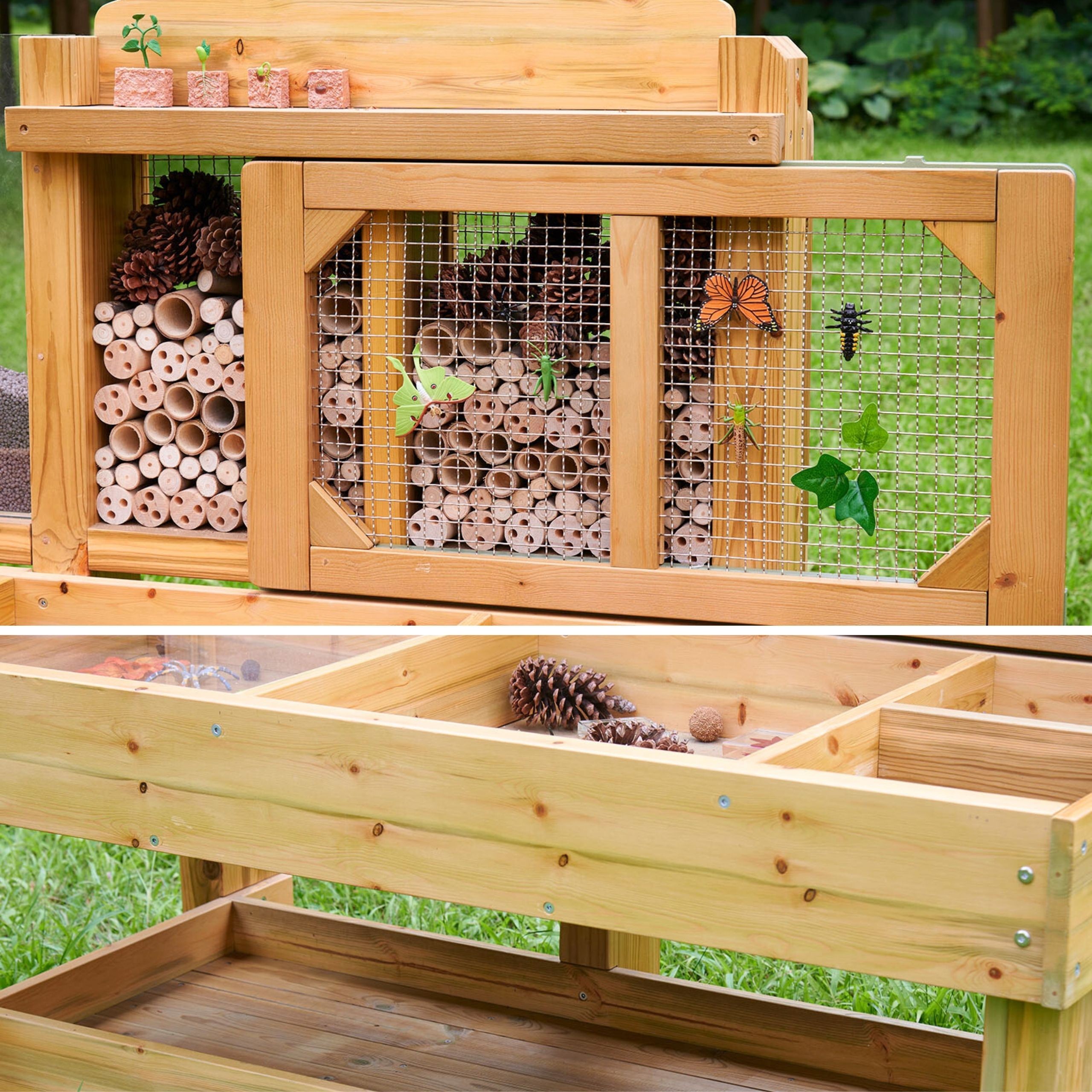 Praktinis „Masterkidz“ gamtos stebėjimo stalas! Specialiai sukurtas gyvųjų organizmų pasaulio tyrinėjimui ir laukinės gamtos pritraukimui į jūsų sodą. Stalo paviršius padalintas į skirtingas zonas natūraliems lobiams rinkti – mažos skiltys žievės gabalėliams ar medžio drožlėms, didesnės – medžio šakoms, lapams ir panašioms gamtos įdomybėms. Stebėjimo stotis aprūpinta skaidriomis, nuimamos talpomis, kad būtų patogu rinkti mėginius, bei dideliu skyriumi su skaidriu dangčiu gyviesiems organizmams stebėti, pavyzdžiui, sraigei slenkant ant akrilo paviršiaus. Galinė plokštė su mediniais vamzdžiais, dengtais plieno tinkleliu, pritraukia ir saugo vabzdžius. Papildomas akrilinis indas leidžia stebėti šaknų augimą, kultūrinių augalų vystymąsi ar kirminų judėjimą natūralioje aplinkoje – įdomi patirtis mažiesiems tyrinėtojams!