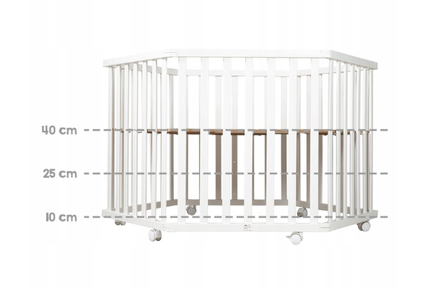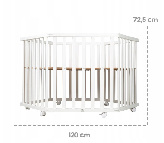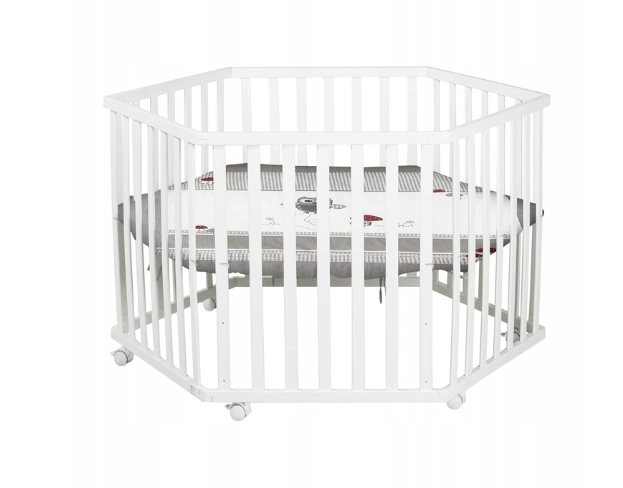 ⋆ Baltas šešiakampis medinis žaidimų aptvaras su minkštu tekstiliniu įdėklu ir plokščiais strypais.