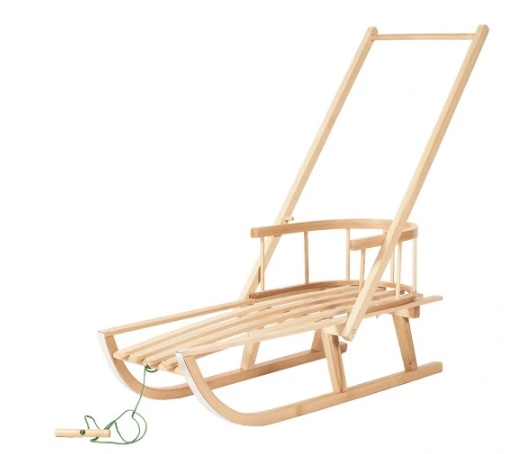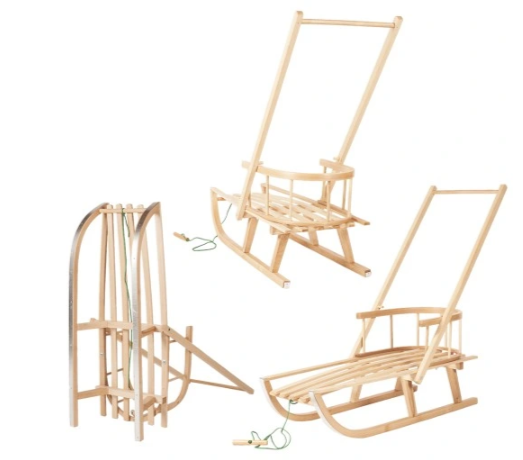Rankų darbo medinės rogės su atlošu ir stūmikliu – komfortas vaikui ir patogumas tėvams. Kokybė, kuri tarnauja metų metus.