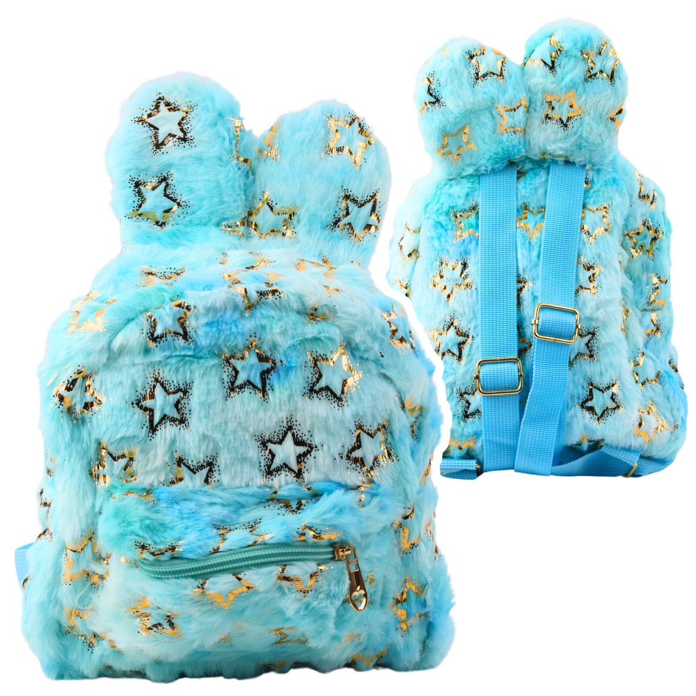 Mėlyna pūkuota vaikiška kuprinė su ausytėmis ir žvaigždutėmis, 24×22 cm