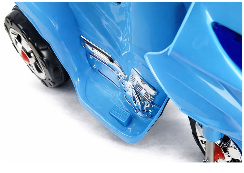 Šis modelis išsiskiria ryškiai mėlynu kėbulu, spalvingais lipdukais ir chromo imitacijos detalėmis, kurios suteikia motociklui tikrovišką, sportišką įvaizdį. Tvirta ABS plastiko konstrukcija užtikrina ilgaamžiškumą, o trijų ratų sistema suteikia stabilumo vaikams, kurie dar tik mokosi išlaikyti pusiausvyrą. Tai puikus pasirinkimas kaip pirmasis elektrinis motociklas.