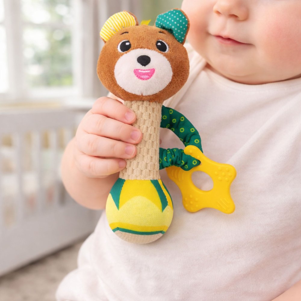 Minkštas meškiuko barškutis – tai švelnus, saugus ir daugiafunkcis sensorinis žaislas, sukurtas kūdikiams nuo pirmųjų gyvenimo mėnesių. Jis lavina mažylio pojūčius, skatina tyrinėti ir suteikia daug džiaugsmo kasdienio žaidimo metu.