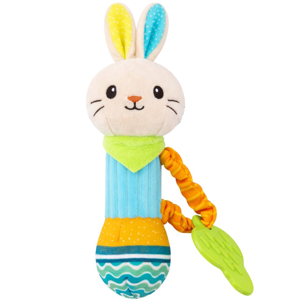minkštas zuikučio barškutis su kramtuku