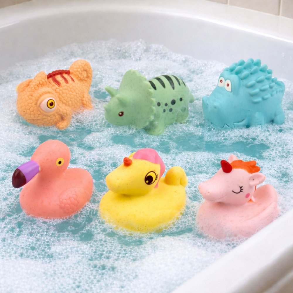 Rinkinyje yra: – 6 minkšti guminiai maudynių žaislai