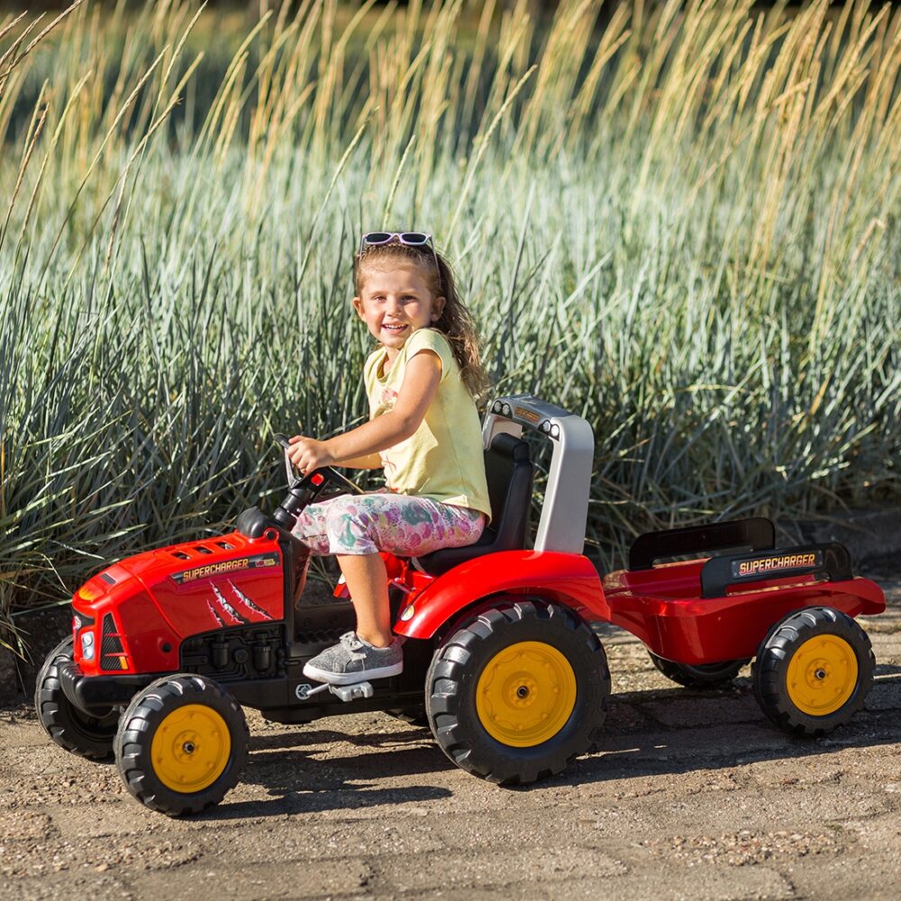 Traktorius su priekaba yra daugelio mažųjų traktorininkų svajonė. Pagamintas kruopščiai, skiriant dėmesį mažiausioms detalėms! Tokios transporto priemonės nepaneigs nė vienas ūkininkas. Transporto priemonė pagaminta iš aukštos kokybės plastiko ir skirta vaikams nuo 3 metų. Transporto priemonėje yra nuimama priekaba su skydais ir vairas su garso signalu. Traktoriaus ratai pagaminti iš aukštos kokybės plastiko. Traktorius taip pat turi atidaromą variklio dangtį su tikro variklio imitacija.