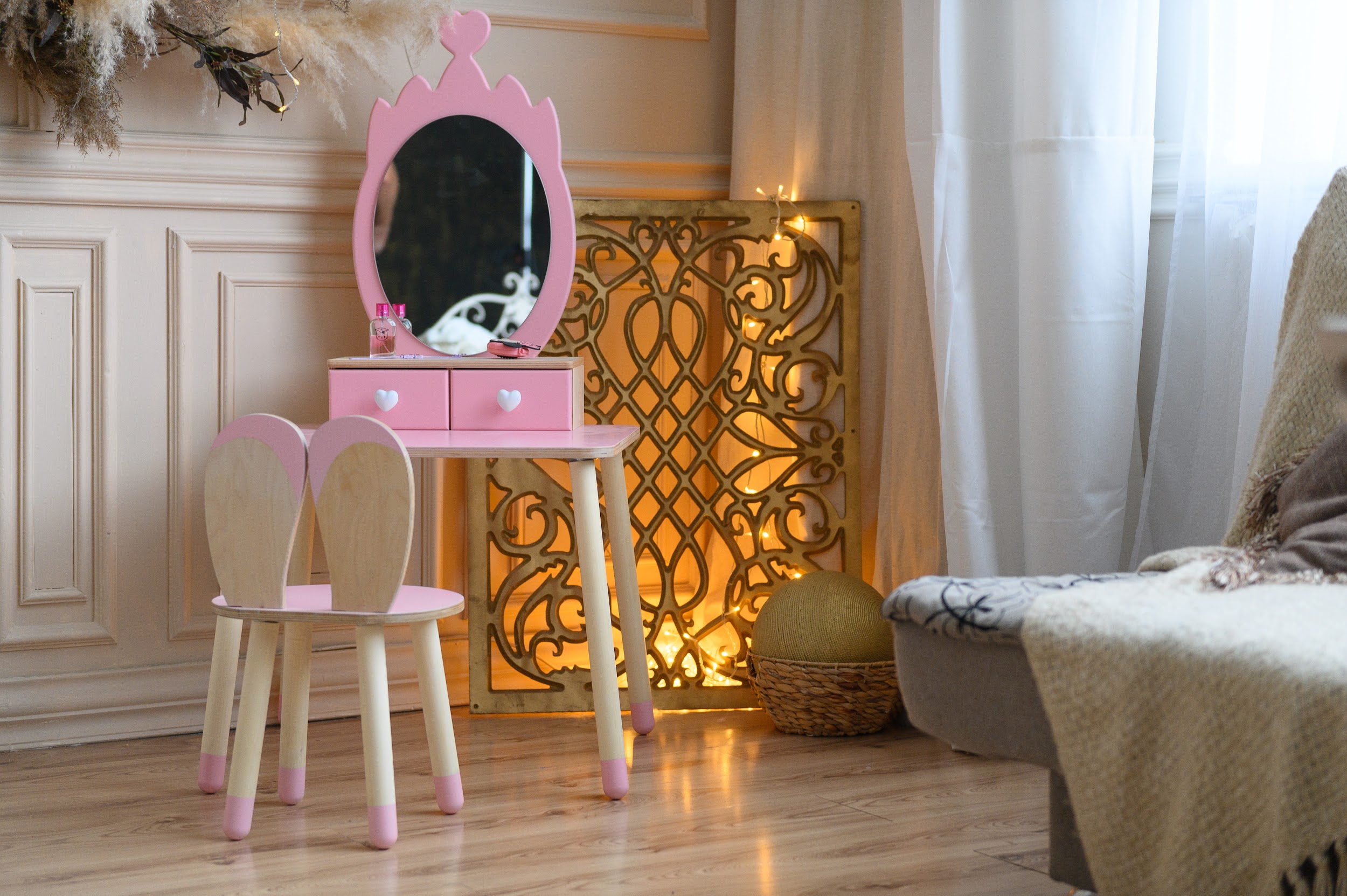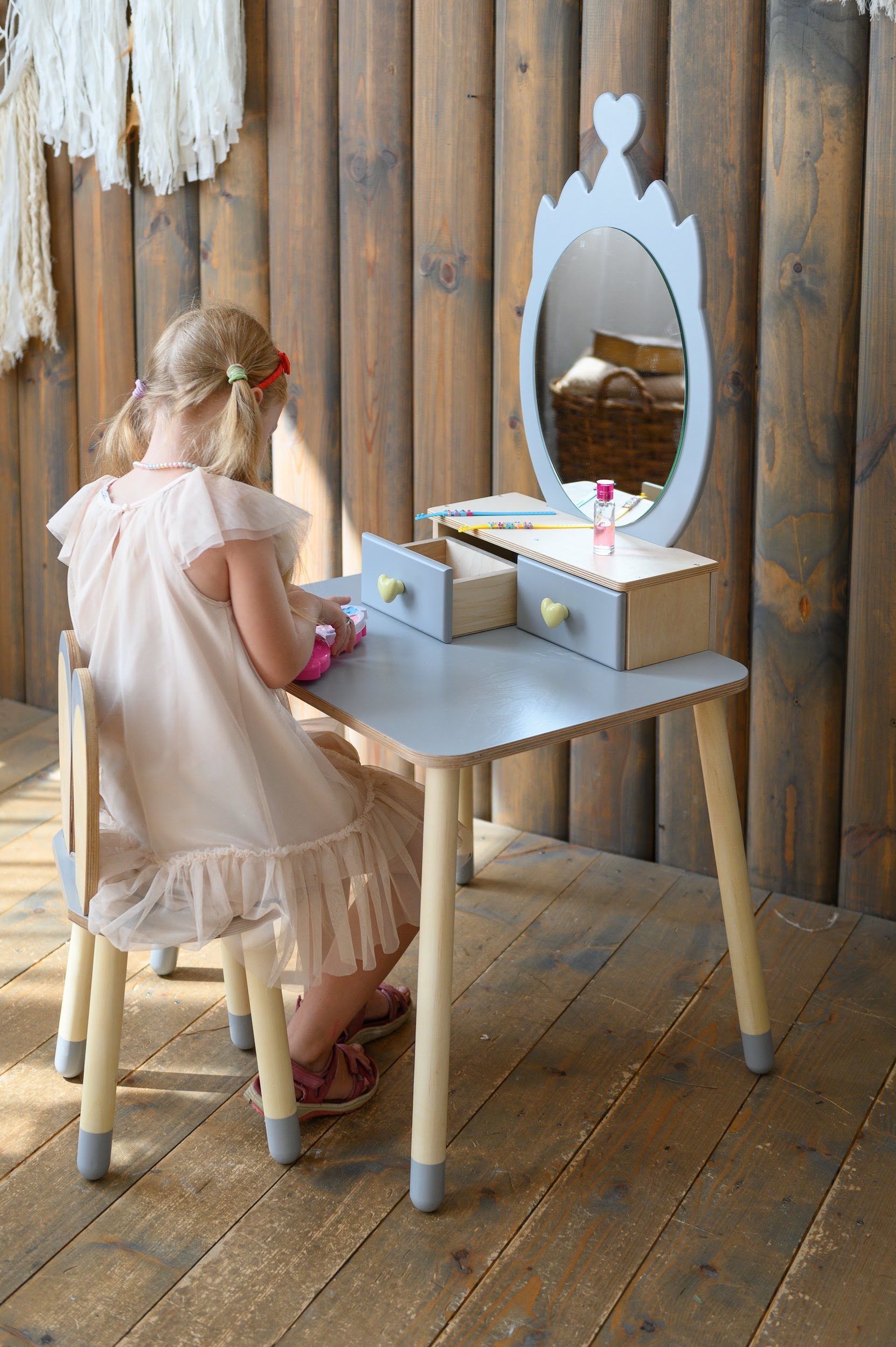 Pakeiskite bet kurio vaiko žaidimų erdvę su šiuo žaviu vaikišku staliukų komplektu, kuriame klasikinis žavesys dera su žaisminga elegancija. Šis komplektas yra daugiau nei žaislas – tai neriboto kūrybiškumo ir vaizduotės vartai. Komplektas yra gražiai suprojektuotas su tvirtu stalu ir prie jo derančia kėde, apsuptu didelio veidrodžio, idealiai tinkančio persirengimo nuotykiams.