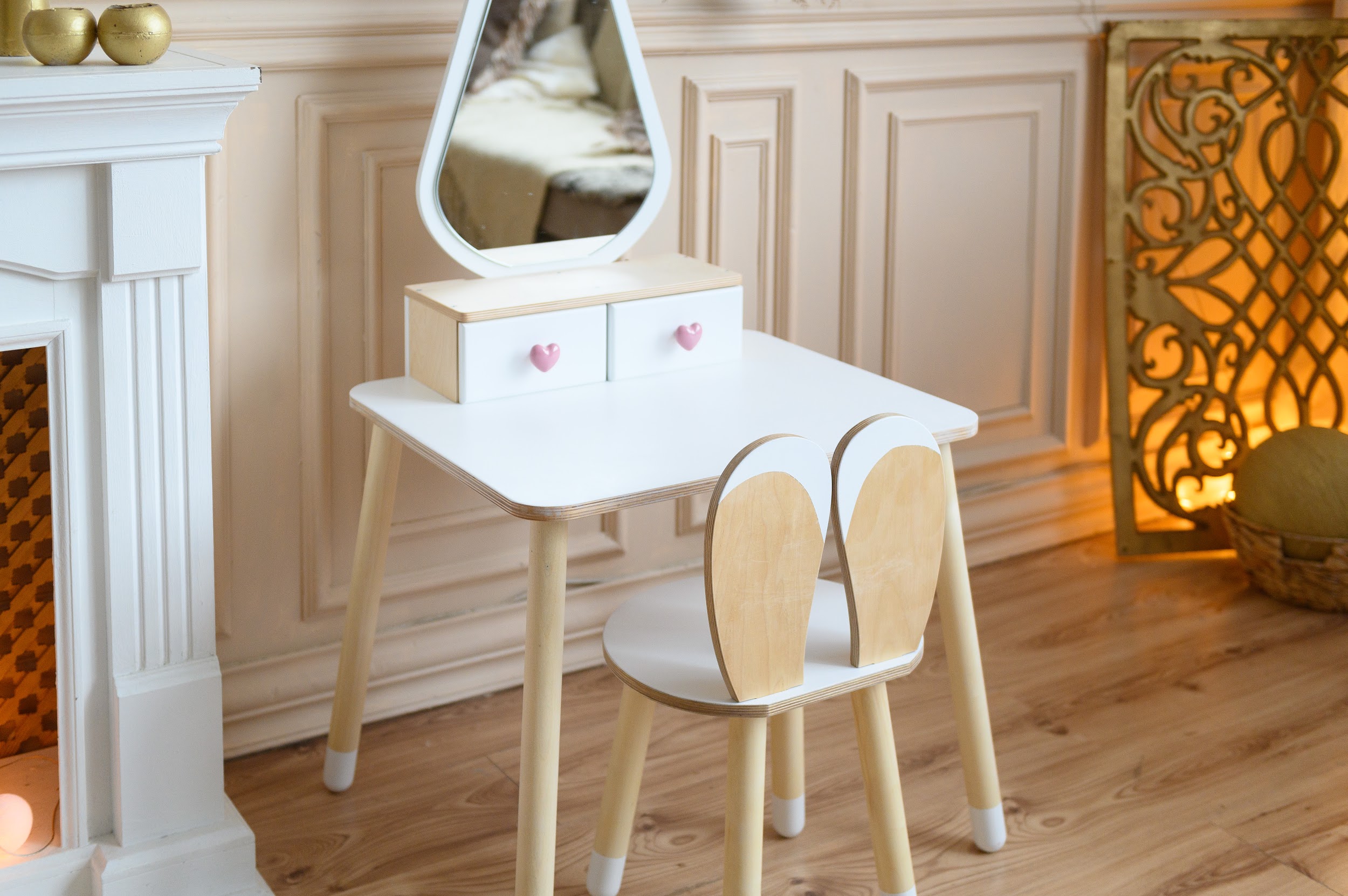 Pakeiskite bet kurio vaiko žaidimų erdvę su šiuo žaviu vaikišku staliukų komplektu, kuriame klasikinis žavesys dera su žaisminga elegancija. Šis komplektas yra daugiau nei žaislas – tai neriboto kūrybiškumo ir vaizduotės vartai. Komplektas yra gražiai suprojektuotas su tvirtu stalu ir prie jo derančia kėde, apsuptu didelio veidrodžio, idealiai tinkančio persirengimo nuotykiams.