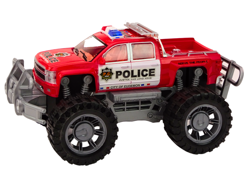 Šis raudonas policijos visureigis – įspūdingas, didelio dydžio modelis, sukurtas mažiesiems policijos nuotykių gerbėjams. Tvirtas korpusas, masyvūs bekelės ratai ir tikroviškos detalės leidžia vaikams kurti patruliavimo, gaudynių ir gelbėjimo scenarijus.