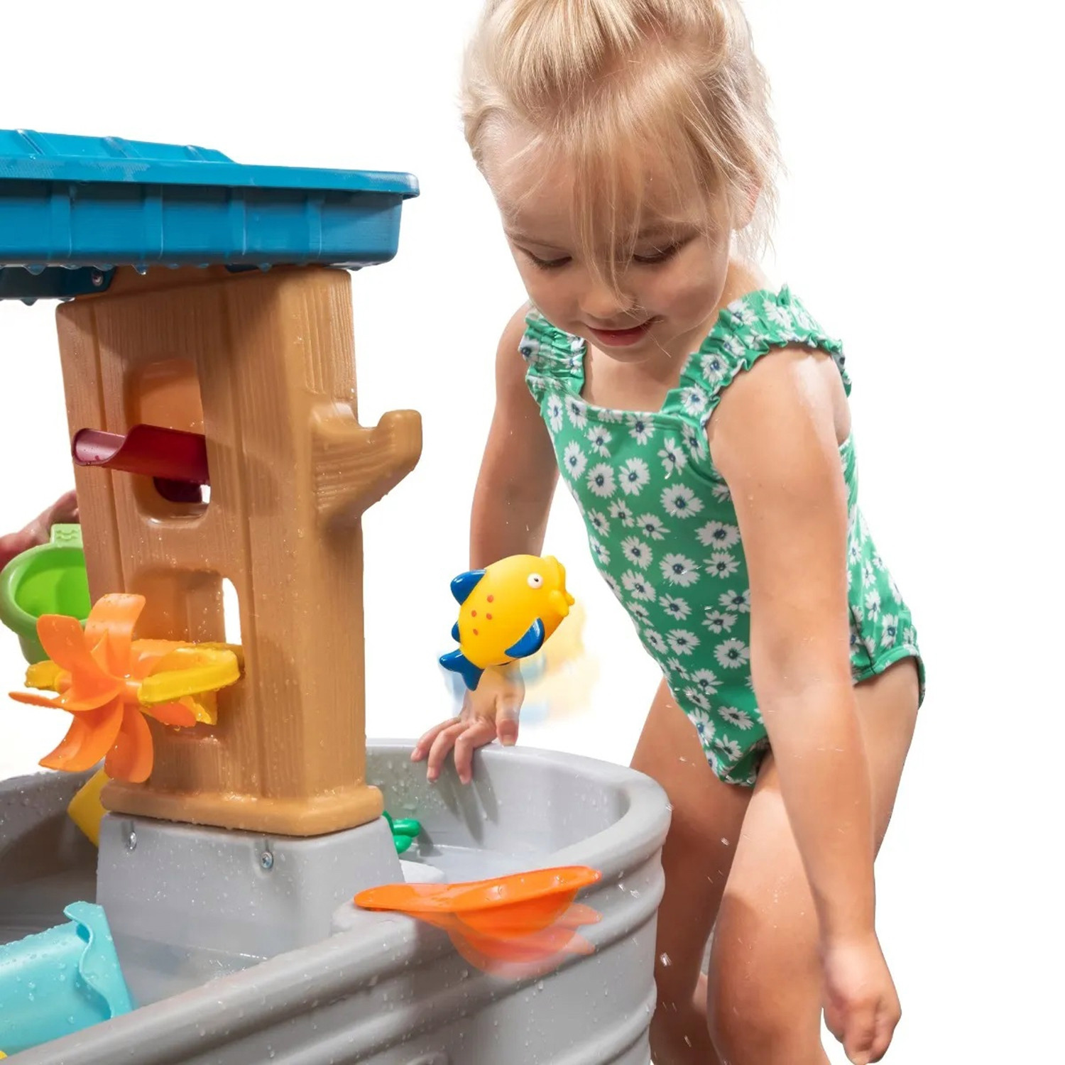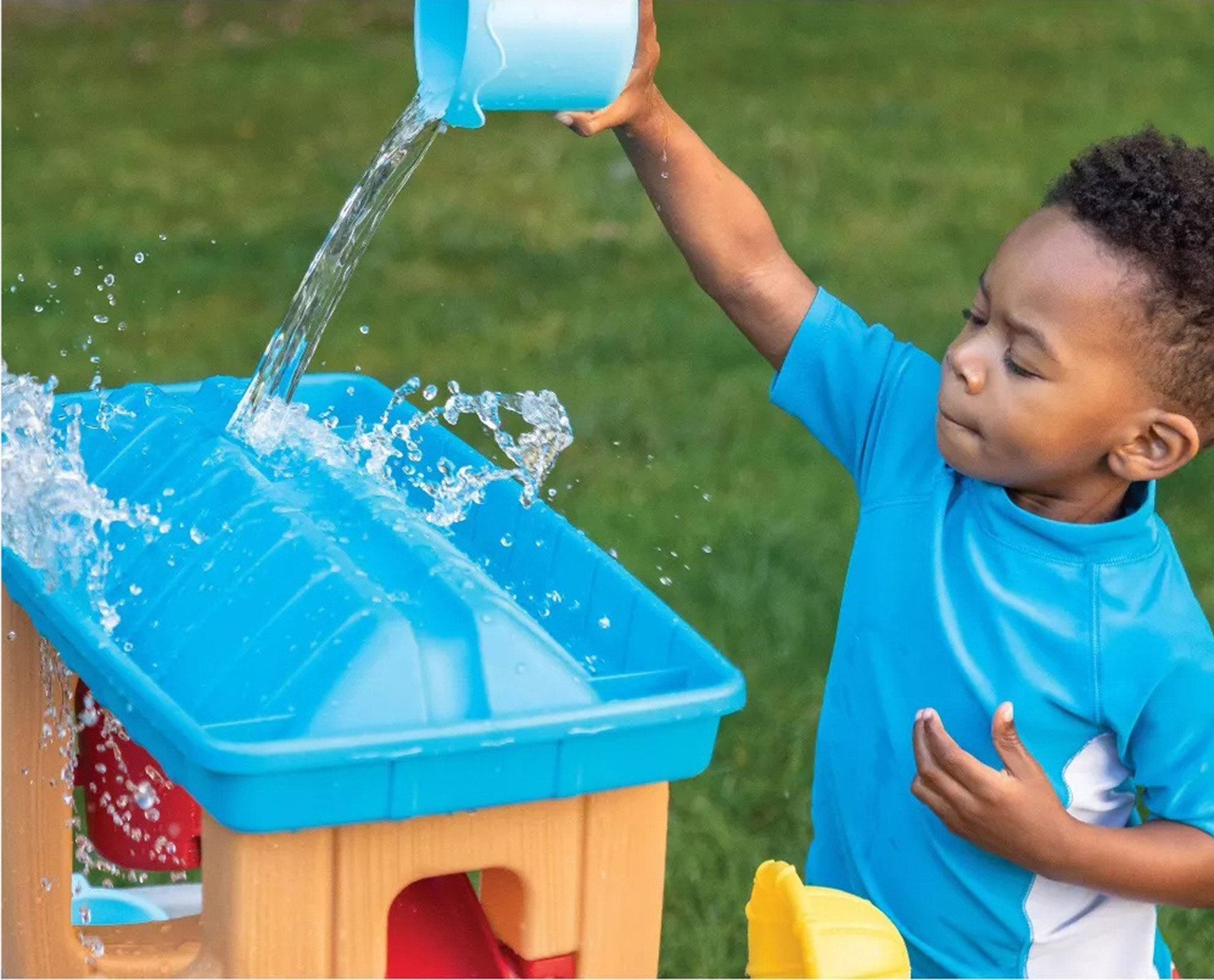 Šis žavingas vaikų vandens stalas suteikia puikią galimybę pasimėgauti vandens žaidimais. Dvigubas stalo indas sukuria realistišką lietaus efektą – tiesiog pilkite vandenį ir smagūs nuotykiai prasideda! Vanduo iš viršutinio indo sukuria lietaus efektą. Vienoje pusėje vanduo teka į kibirą, kuris, kai užsipildo, apsisuka ir išpilama vandens, o kitoje pusėje yra čiaupas, kuris nukreipia vandenį tiesiai į besisukantį ventiliatorių. Komplekte taip pat yra šokinėjimo platforma gyvūnams, kibiro laikiklis ir sietelis. Viskas nusileidžia į baseiną apačioje.