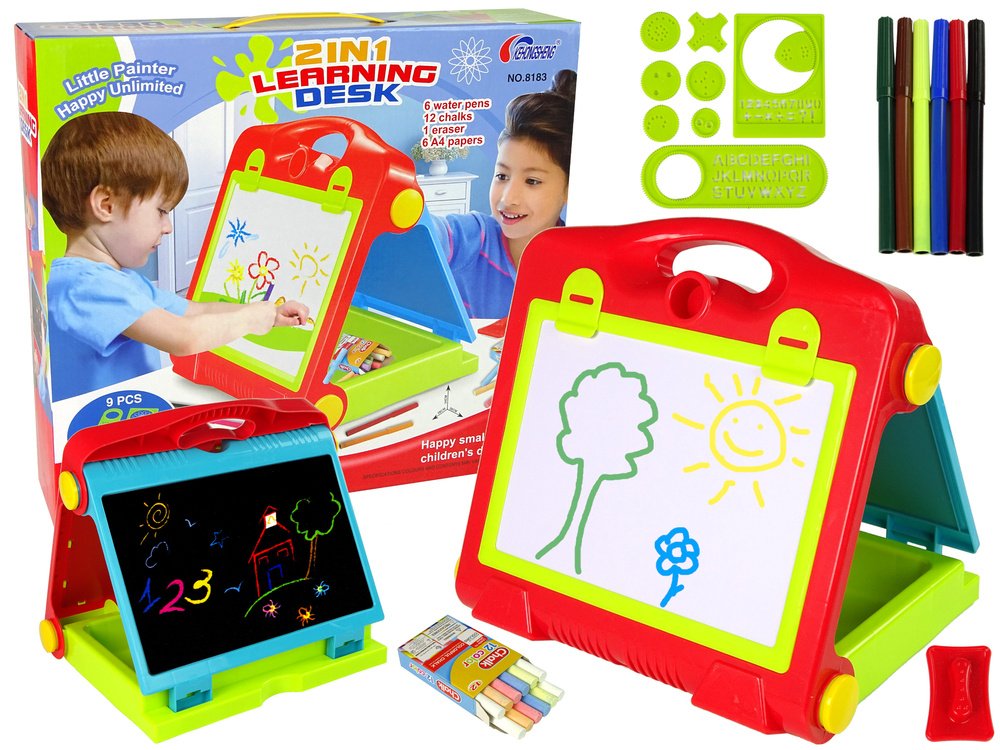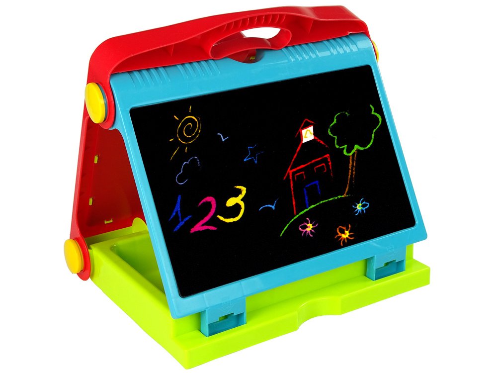 Sulankstoma edukacinė lenta lagamine – tai praktiškas ir kūrybiškas žaislas, kuris leidžia vaikams piešti, rašyti, kurti ir mokytis bet kur. Dvipusė konstrukcija suteikia dvi skirtingas veiklas: juodoji pusė skirta piešti kreidele, o baltoji – markeriais. Lenta išsiskleidžia į dvi puses, todėl vienu metu gali kurti net du vaikai.