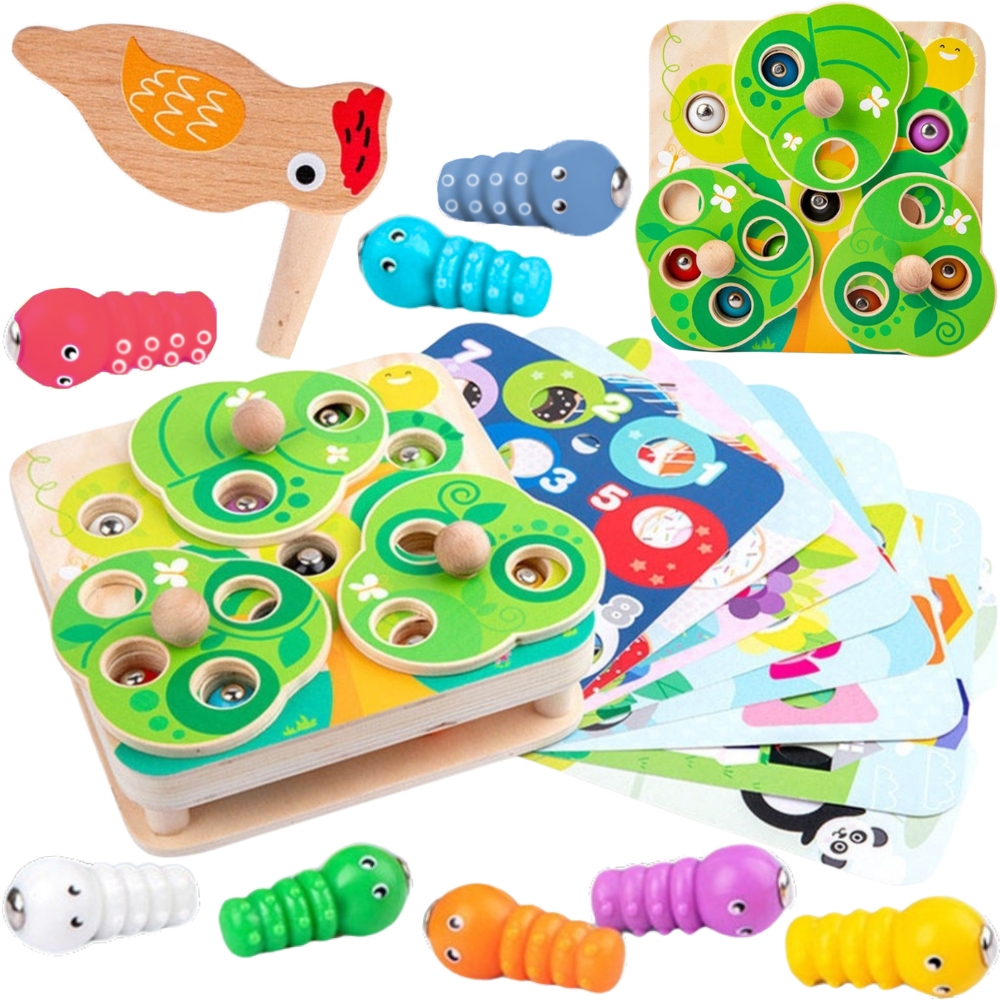 Šis spalvingas, medinis magnetinis vikšrų gaudymo žaidimas iš TOOKY TOY su žaviu geniu derina įgudusį žaidimą su lavinimu. Pridedamos medinės lentos leidžia mokytis spalvų, skaičių, formų ir gyvūnų. Besisukantys lapai užstoja vikšrus, taip suteikdami žaidimui iššūkį . Tvirta, lygi konstrukcija ir magnetai užtikrina, kad kiekvieną kartą ištraukus vikšrą, tai būtų naudinga ir skatintų toliau žaisti.