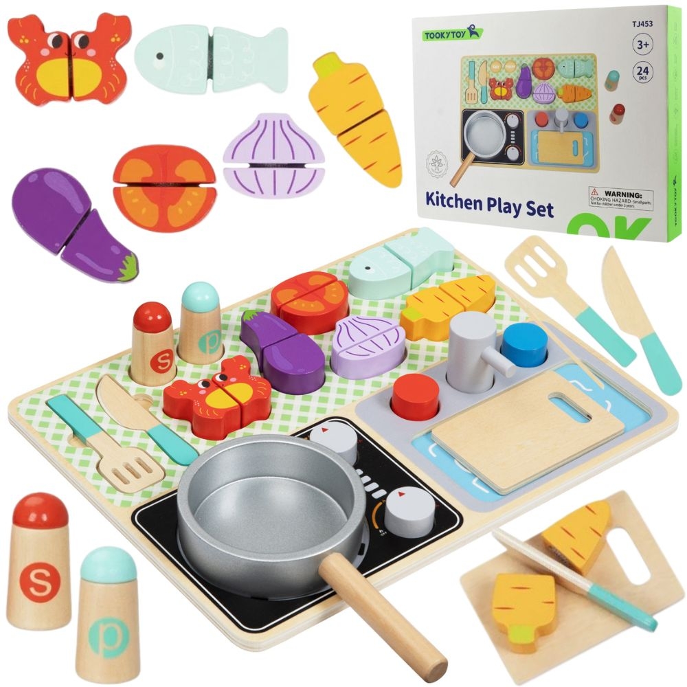 Paverskite įprastus žaidimus tikru kulinariniu nuotykiu! Šis spalvingas medinis virtuvės komplektas puikiai tinka mažiesiems maisto gaminimo entuziastams. Saugūs, tvirtai sukonstruoti komponentai leis jūsų vaikui pasijusti tikru virėju!