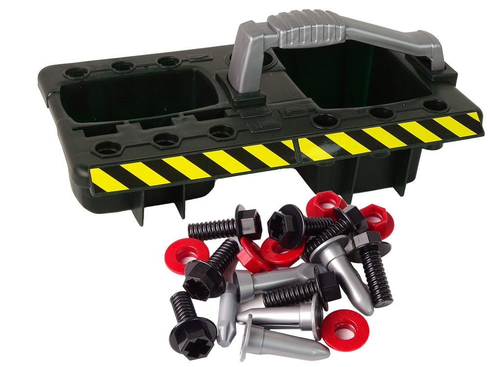 Organizatorius turi dvi dalis: vienoje laikomas baterinis suktuvas, kitoje – varžtai, veržlės ir kiti priedai. Visi įrankiai pagaminti iš saugaus plastiko, jų dydis pritaikytas mažoms rankoms. Baterijomis veikiantis suktuvas sukasi paspaudus mygtuką ir skleidžia tikrovišką garsą, todėl žaidimas tampa dar įdomesnis ir realistiškesnis.