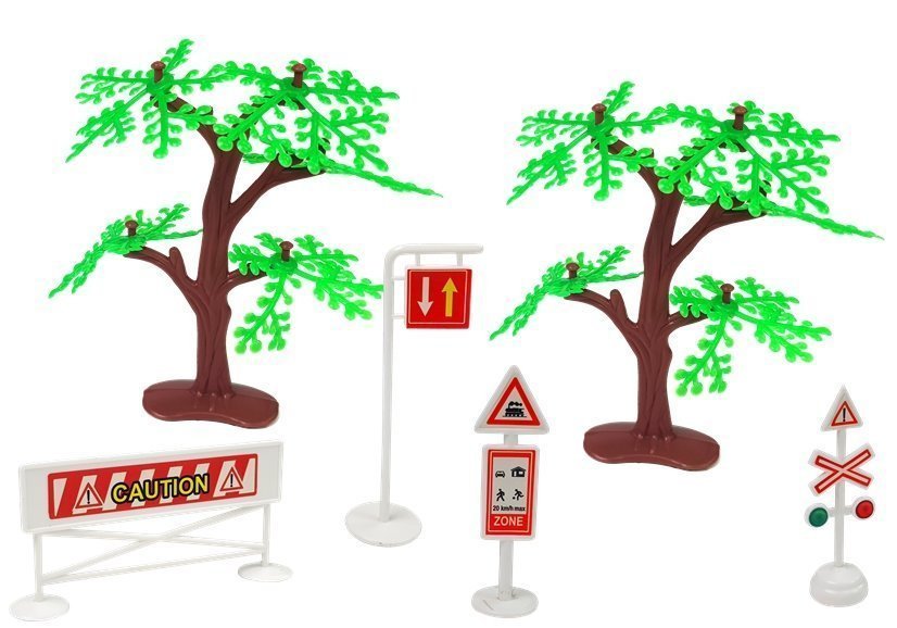 Rinkinyje yra įvairių formų bėgiai, kelio ženklai, medžiai, traukinys ir du vagonai. Trasą galima surinkti net keturiais skirtingais ilgiais: 70 cm, 88 cm, 111 cm ir ilgiausia – 153 cm. Tai leidžia vaikui kurti vis naujus maršrutus ir žaisti be monotonijos.