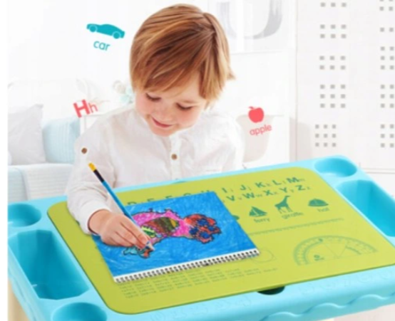 Dvipusis stalviršis: viena vertus, lygus – skirtas piešimui, paprastų žodžių (anglų k.) mokymuisi, rašymui, lipdymui, minkymui ir tapybai; kita vertus – sukurtas taip, kad tiktų visų pirmaujančių prekių ženklų kaladėlėms, leisdamas jūsų vaikui maksimaliai išnaudoti šį daugiafunkcį stalą.
