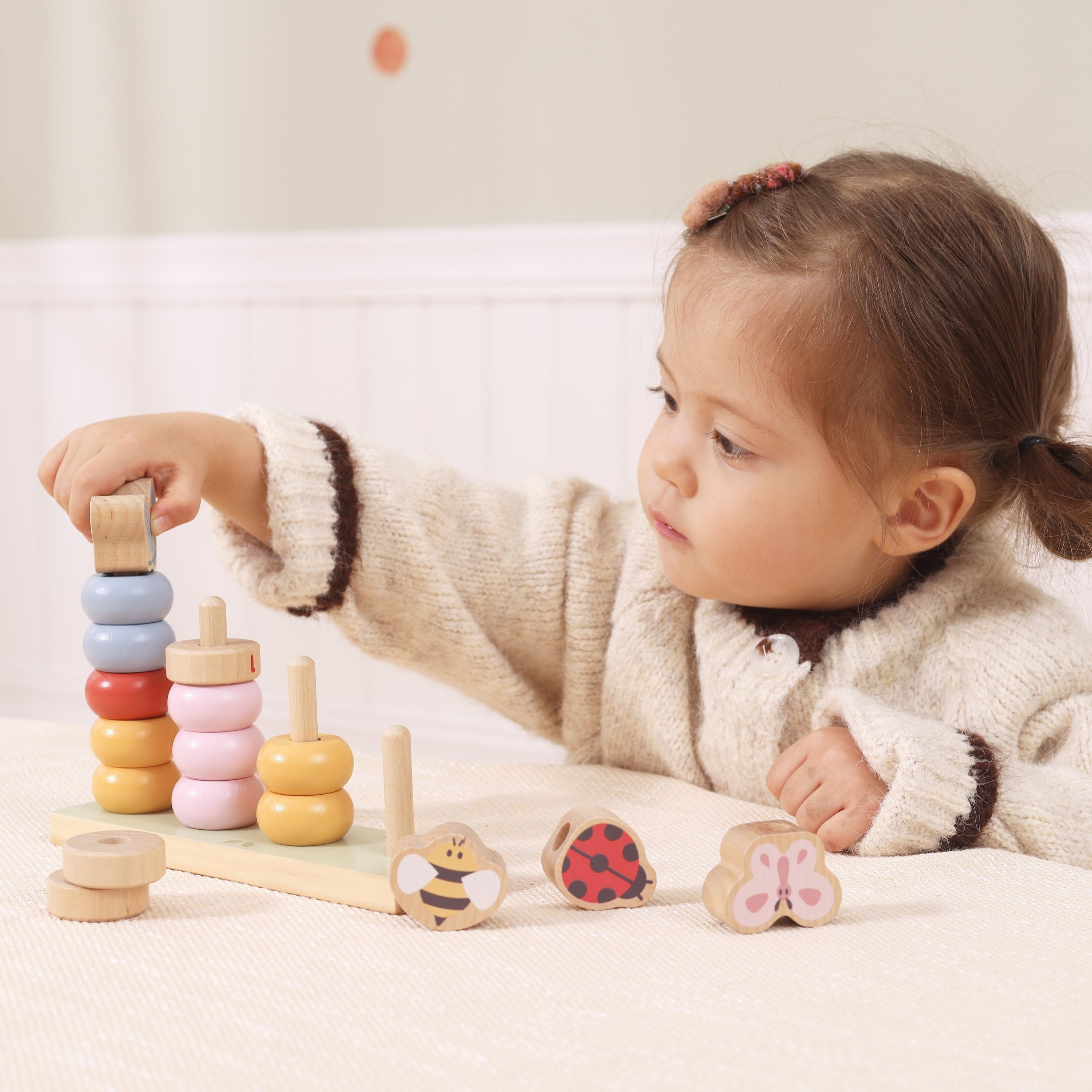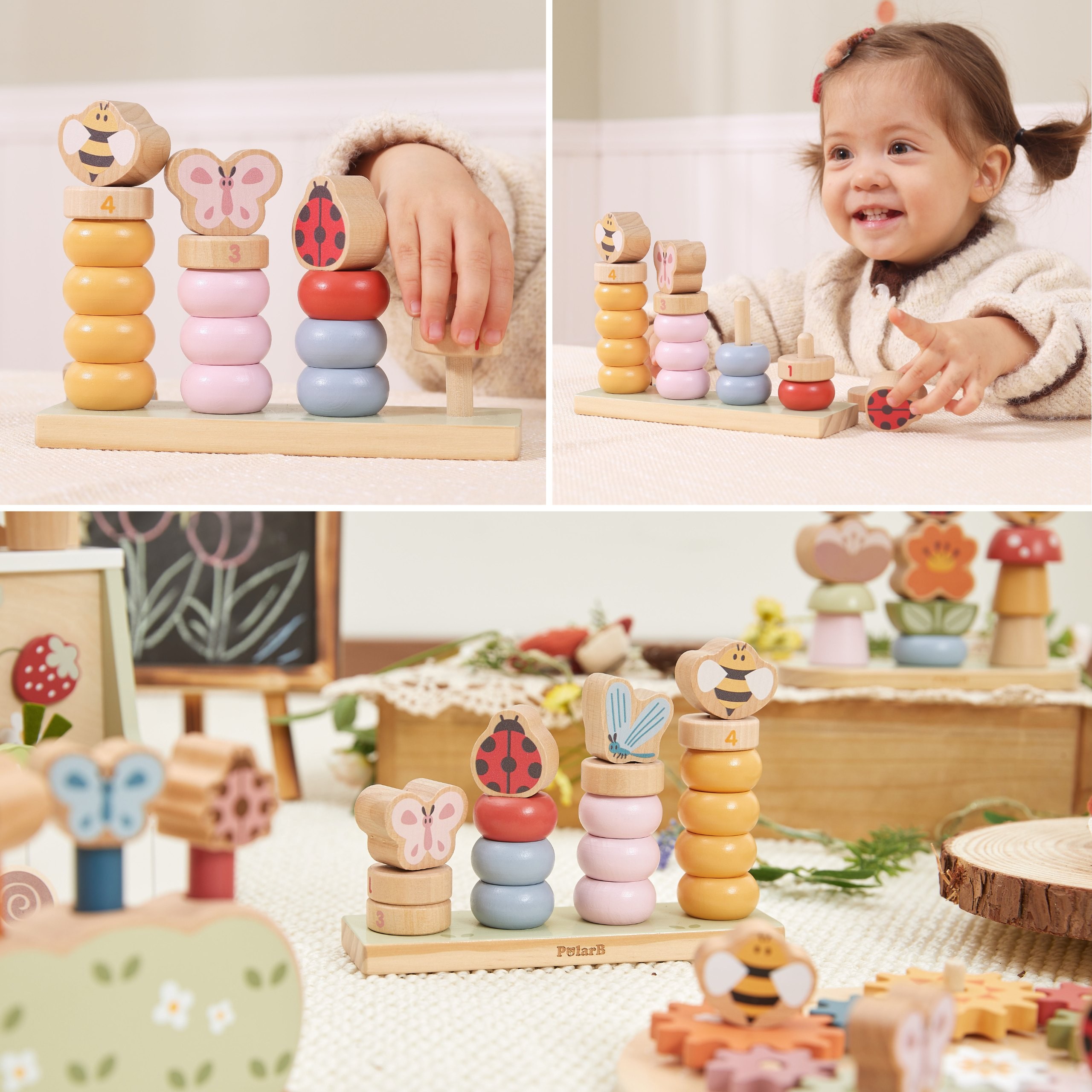 Medinė dėlionė „Pavasaris“ iš Viga yra linksmas žaidimas, natūraliai supažindinantis vaikus su skaičiavimo ir loginio mąstymo pasauliu. Spalvingos detalės su mielais vabzdžių motyvais skatina mažylius dėlioti, rūšiuoti ir eksperimentuoti. Žaidime reikia detales dėti ant smeigtukų, derinti pagal spalvas, dydžius ir skaičius. Tai leidžia vaikams mokytis per veiksmą savo tempu. Puikus mokymosi, lavinimo ir smagaus žaidimo derinys namuose, darželyje ar ikimokyklinėje įstaigoje.