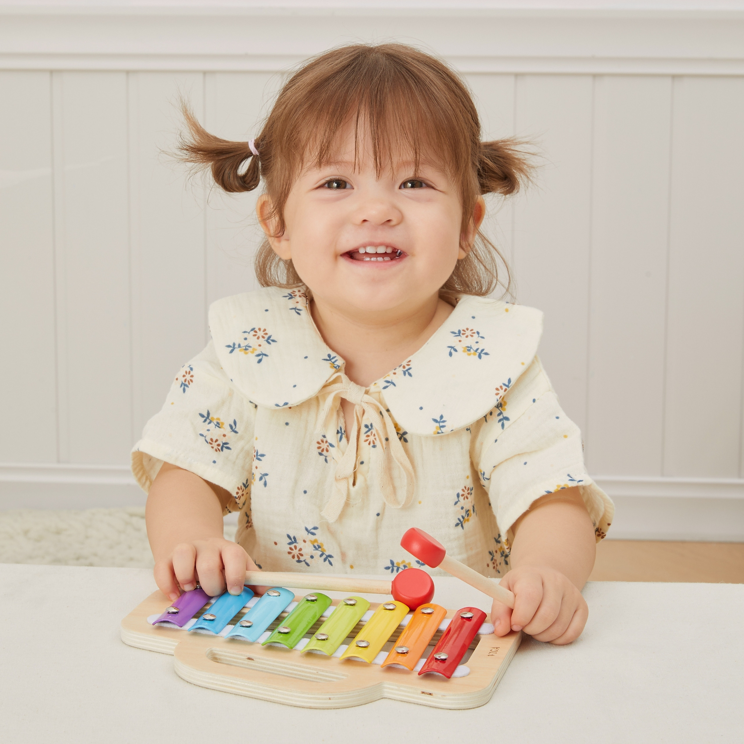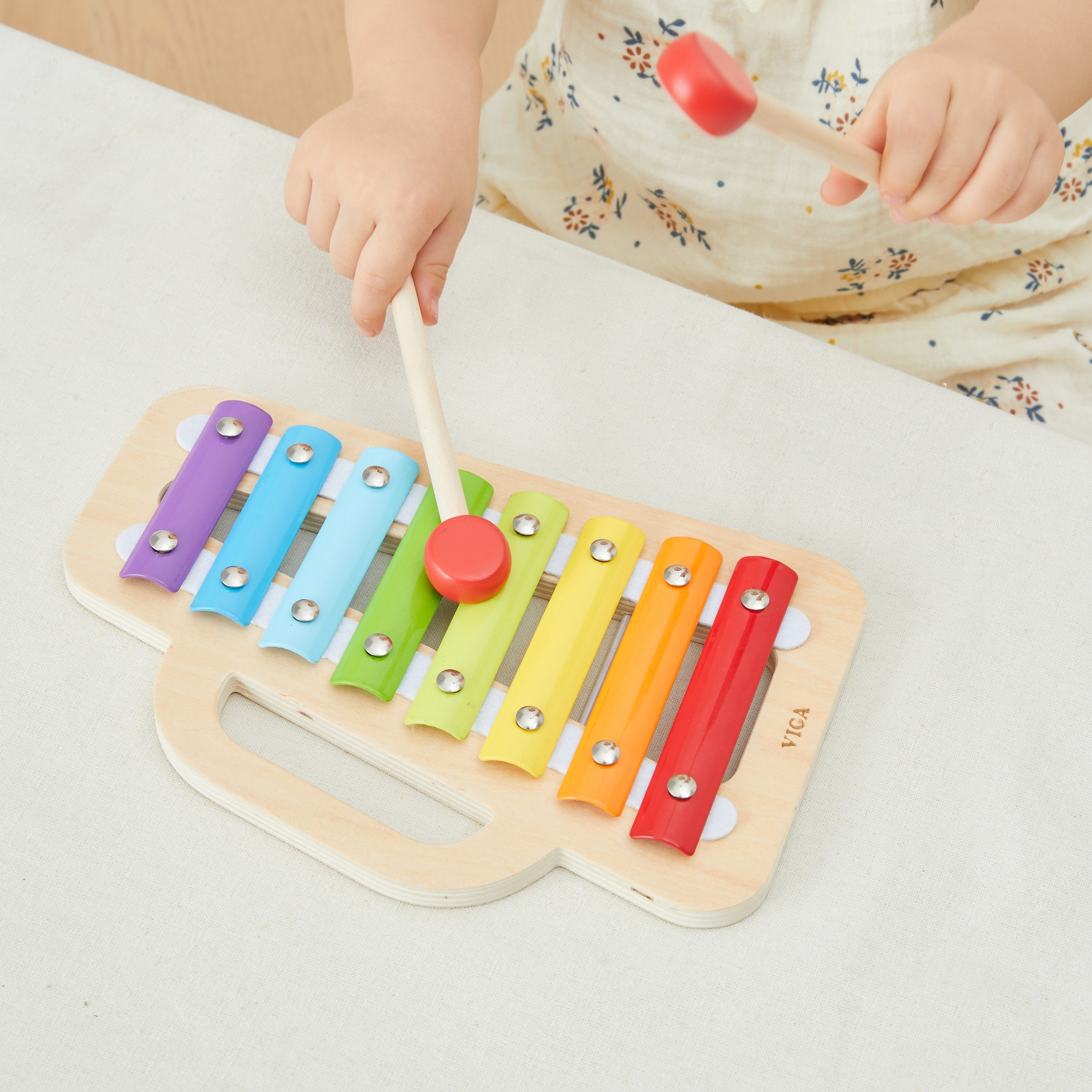 Šis spalvingas medinis ksilofonas yra puikus pirmasis muzikinis žaislas vaikams nuo 18 mėnesių amžiaus. Jis skleidžia aštuonis švarius garsus, kurie supažindina mažylį su muzikos ir ritmo pasauliu. Vaivorykštės spalvos pritraukia dėmesį ir skatina žaisti, lavindamos kūrybiškumą bei koncentraciją. Integruota plaktukų laikymo vieta ir šoninė rankena leidžia lengvai laikyti bei nešioti ksilofoną. Tai puiki dovana, jungianti žaidimą, muzikinį mokymąsi ir smulkiąją motoriką.