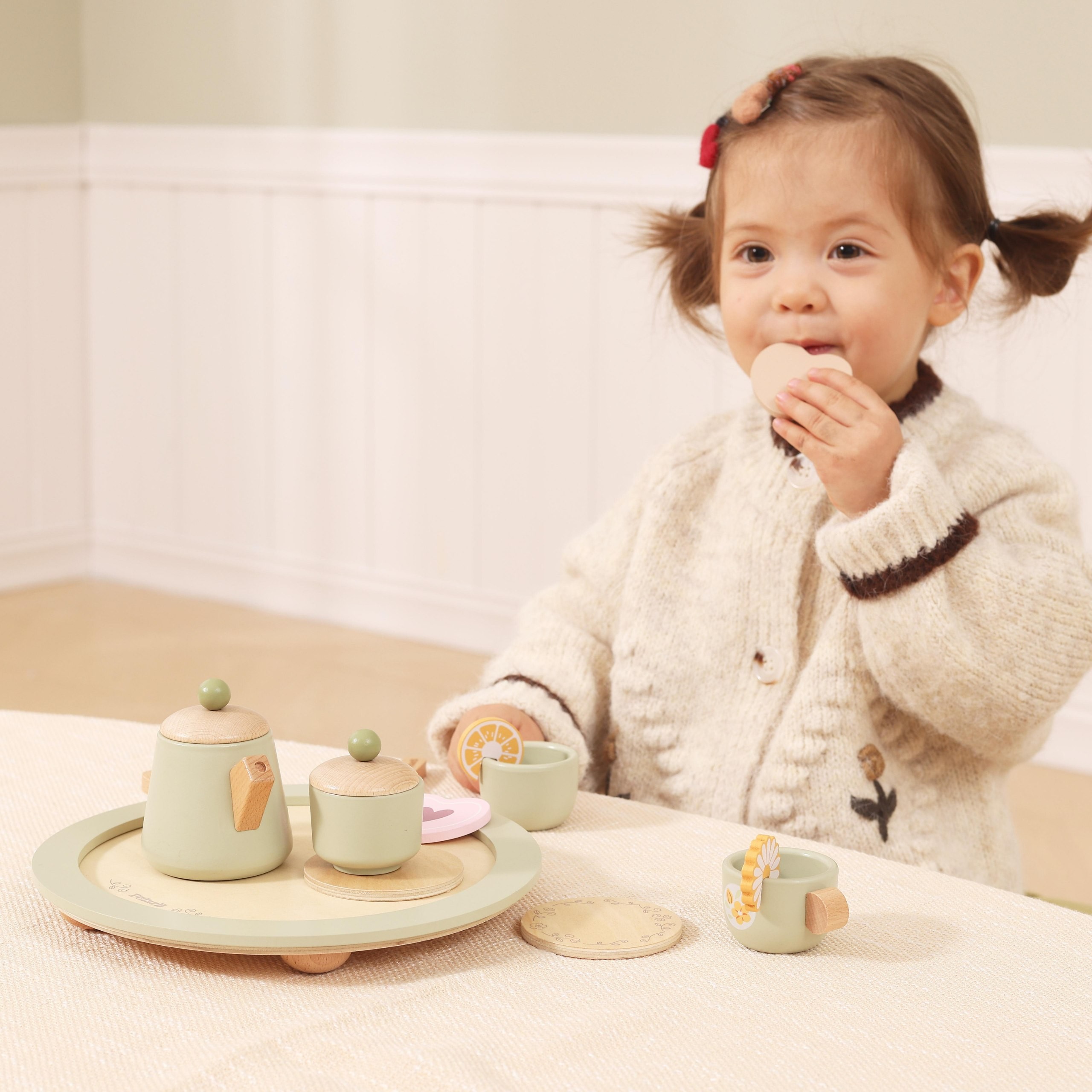 Pakvieskite draugus į popietinę arbatėlę su nuostabiu VIGA mediniu arbatos servizu, kuris džiugina skandinavišku dizainu ir dėmesiu detalėms! Šis 15 dalių rinkinys leis jūsų vaikui tapti modelišku šeimininku, patiekti skanius gėrimus ir sausainius ant elegantiško, apvalaus padėklo. Pastelinės spalvos su citrinos motyvu ir lygios, saugios kraštinės daro žaislą ne tik puošmena kambariui, bet ir saugiu įrankiu vaizduotei lavinti. Dėl realistiškų priedų vaikas išmoks gerų manierų, socialinių vaidmenų žaidimo ir dalijimosi su kitais meną, smagiai leidžiant laiką kartu. Tai puiki dovana ikimokyklinukui – derina klasikinį namų žaidimą su smulkių rankų lavinimu kūrybingoje ir žaismingoje aplinkoje.