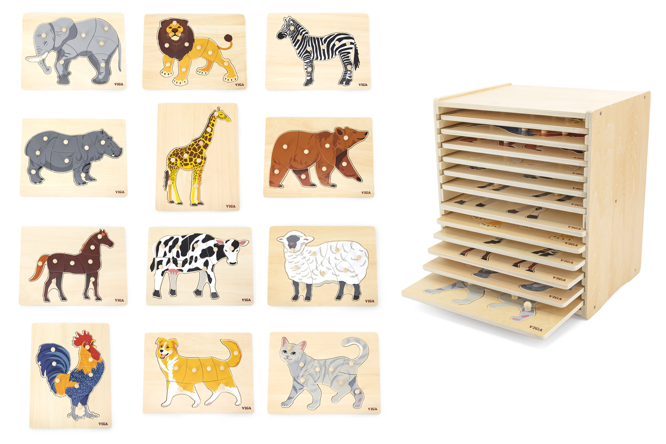 VIGA Medinių dėlionių rinkinys – 12 Montessori gyvūnų dėlionių su stovu