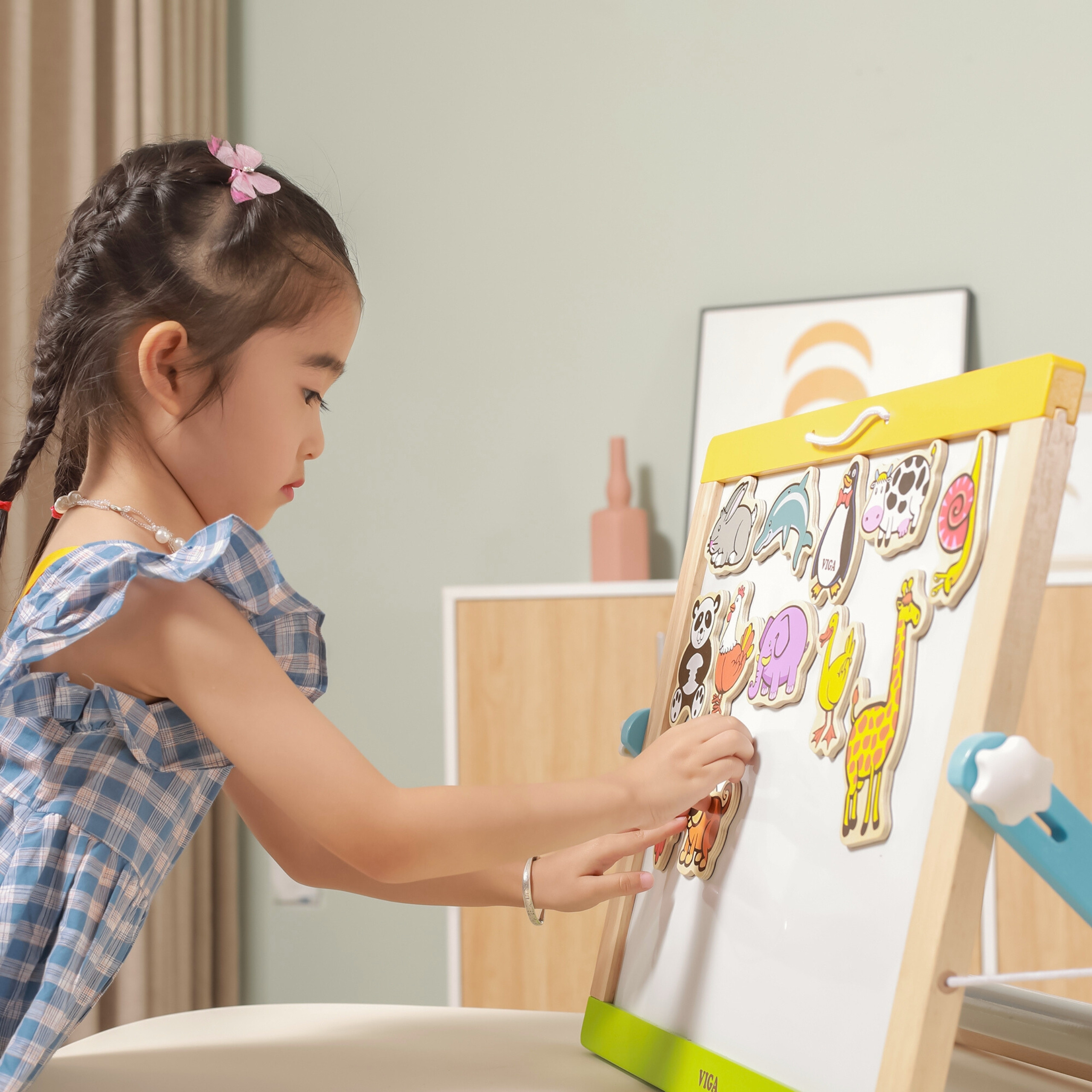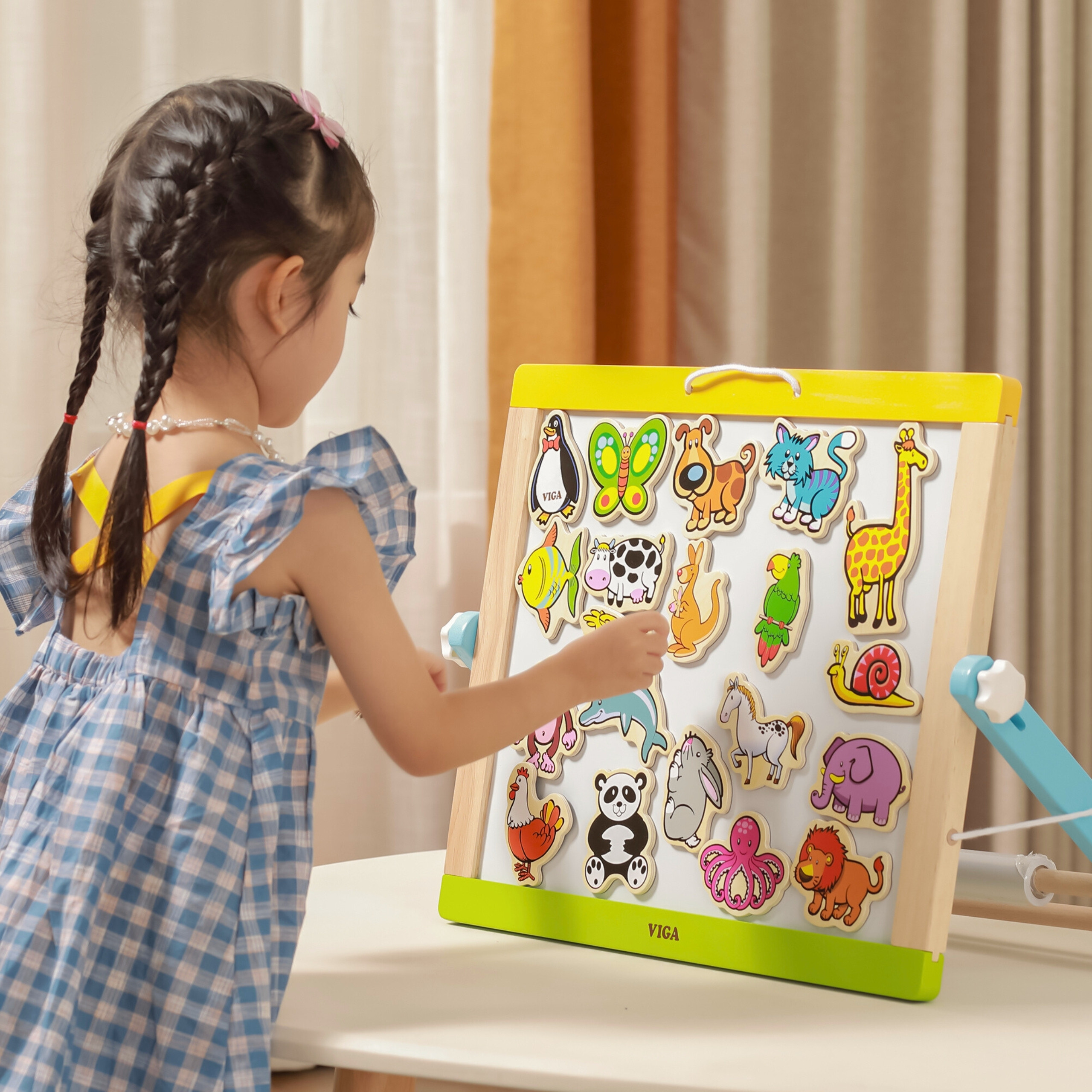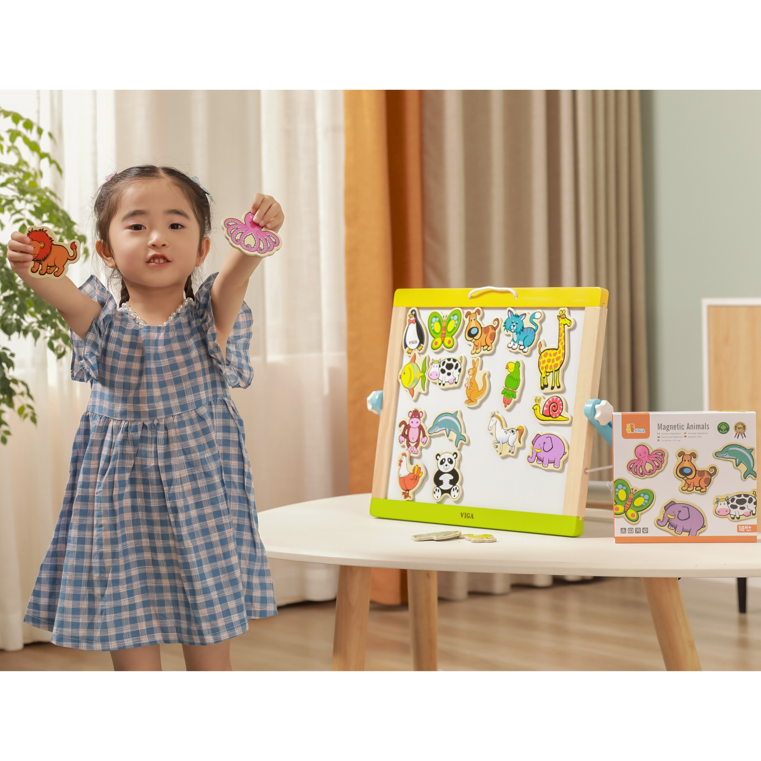 VIGA medinių gyvūnų magnetai – unikalus 20 spalvingų dalių rinkinys, kuris nukels vaikus į įdomų faunos pasaulį. Kiekvienas magnetas vaizduoja skirtingą gyvūną, todėl žaidimas tampa įvairus ir įtraukiantis. Rinkinys pagamintas iš aukštos kokybės medžio, užtikrinant patvarumą ir saugumą kasdienio naudojimo metu ant magnetinių lentų ar šaldytuvo. Šie magnetiniai gyvūnai nėra tik žaislas – jie taip pat puiki mokomoji priemonė. Dėl jų vaikai gali mokytis gyvūnų pavadinimų, jų natūralių buveinių ir klasifikacijos. Ryškios spalvos ir estetiškas dizainas patrauklūs akiai, skatina kūrybiškai kurti savo istorijas ir scenas su ūkio, safario ar jūros gyventojais.