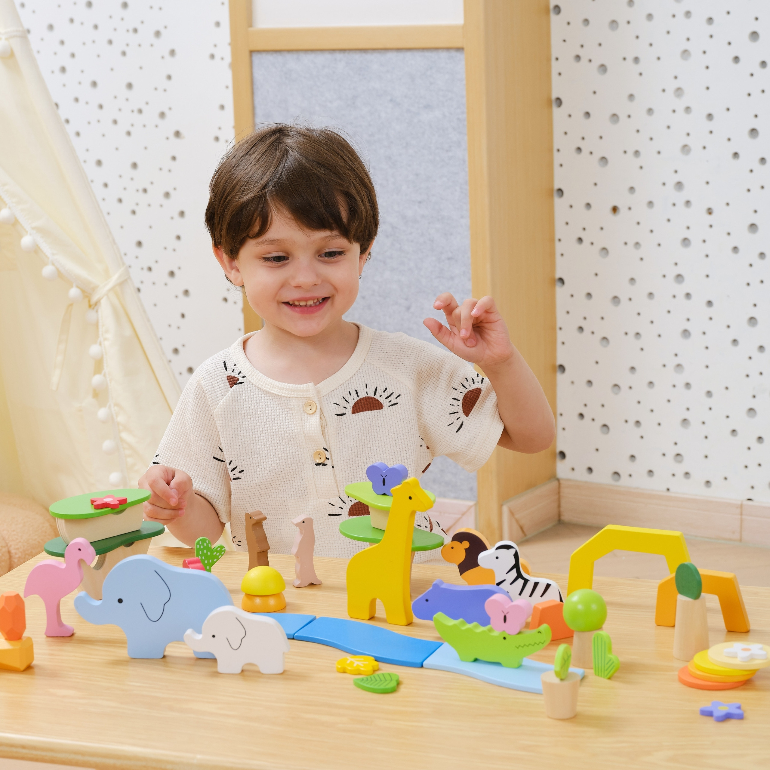 Perkelkite vaiką į Afrikos nuotykių pasaulį su VIGA spalvingų „Tropical Stories“ kaladėlių rinkiniu! Šis itin turtingas rinkinys, sudarytas iš 55 medinių laisvų detalių, yra tikra atviro tipo (open-ended) žaidimo esmė, paremta Montessori principu. Savanos gyvūnų figūrėlės – dramblys, žirafa, liūtas ir zebra – kartu su tropinės augmenijos ir upės elementais įkvepia vaikus kurti savo istorijas ir lavinti kūrybiškumą. Kaladėlės padeda lavinti smulkiąją motoriką bei dėmesio koncentraciją, o patogi medinė dėžutė su skyreliais leidžia lengvai susitvarkyti po žaidimo.