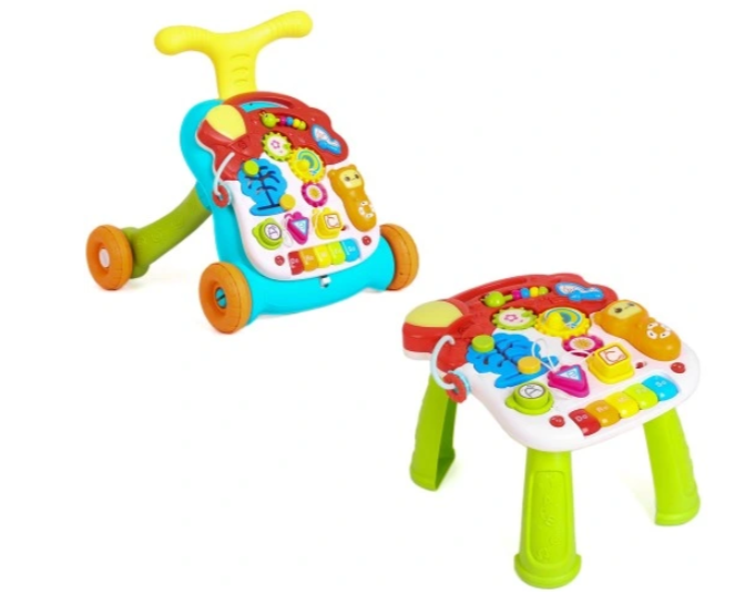 Priekinę panelę galima nuimti nuo vaikštynės/stūmiklio, o ant jos pritvirtinti komplekte esančias kojeles. Vaikštynę galima naudoti atskirai su muzikiniu stalu.