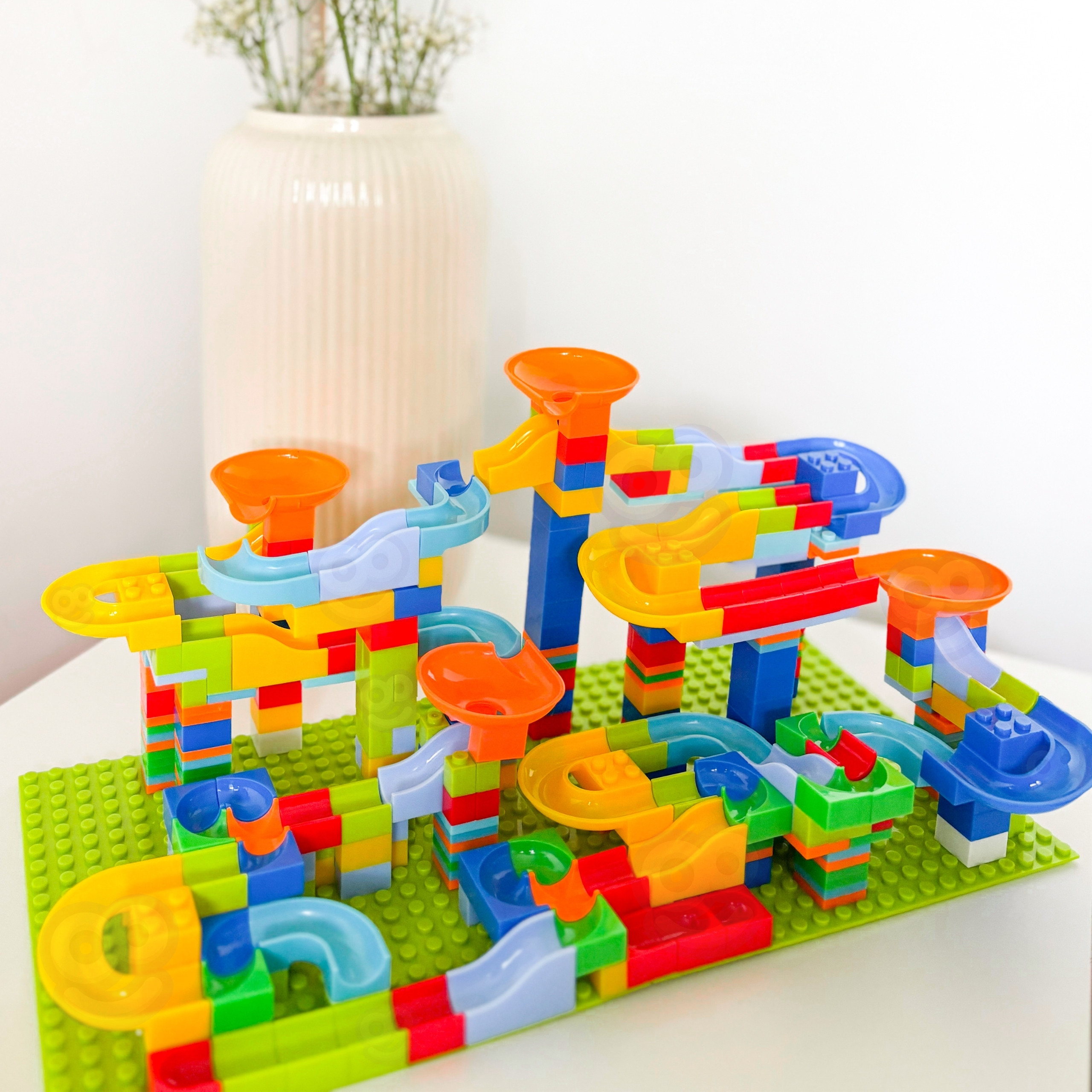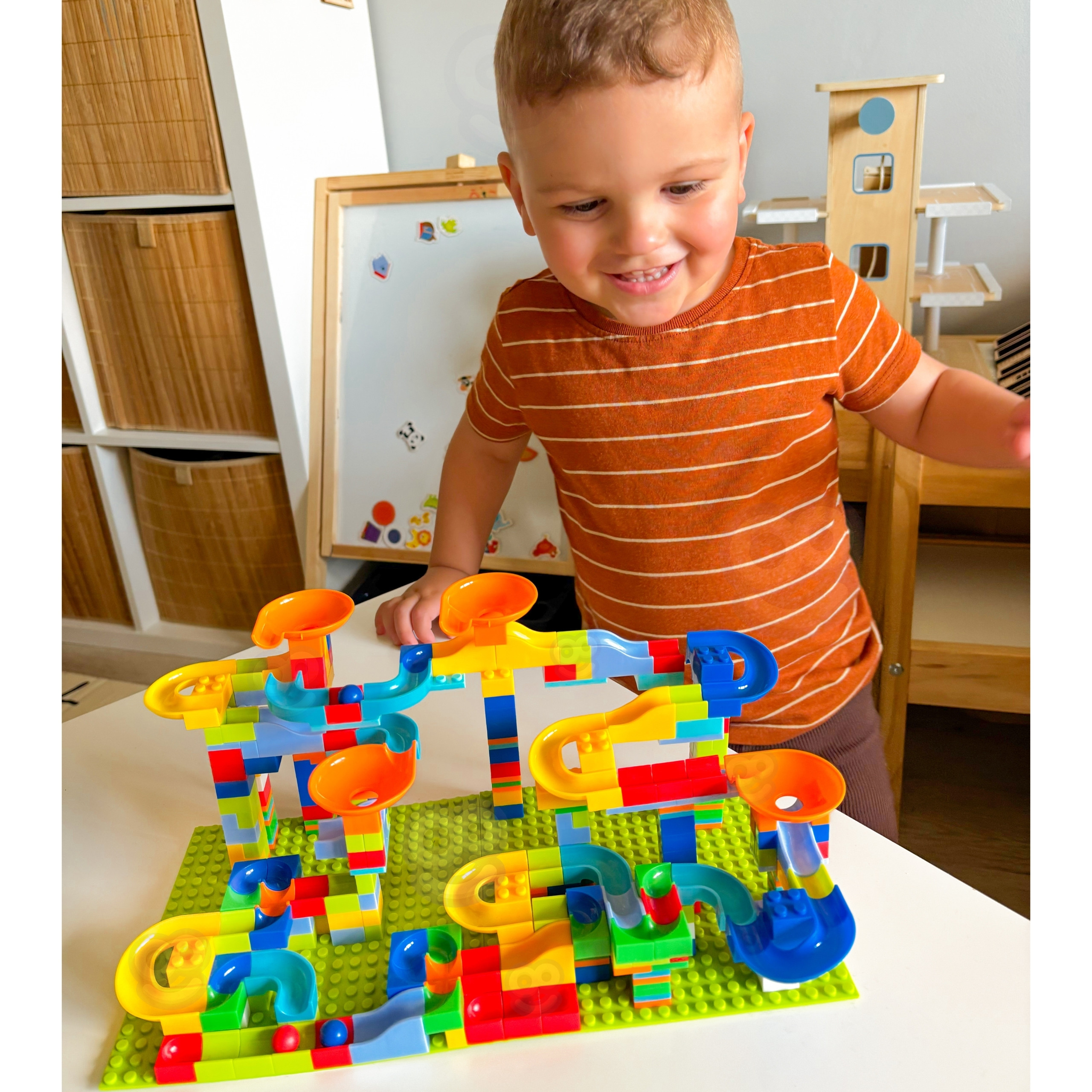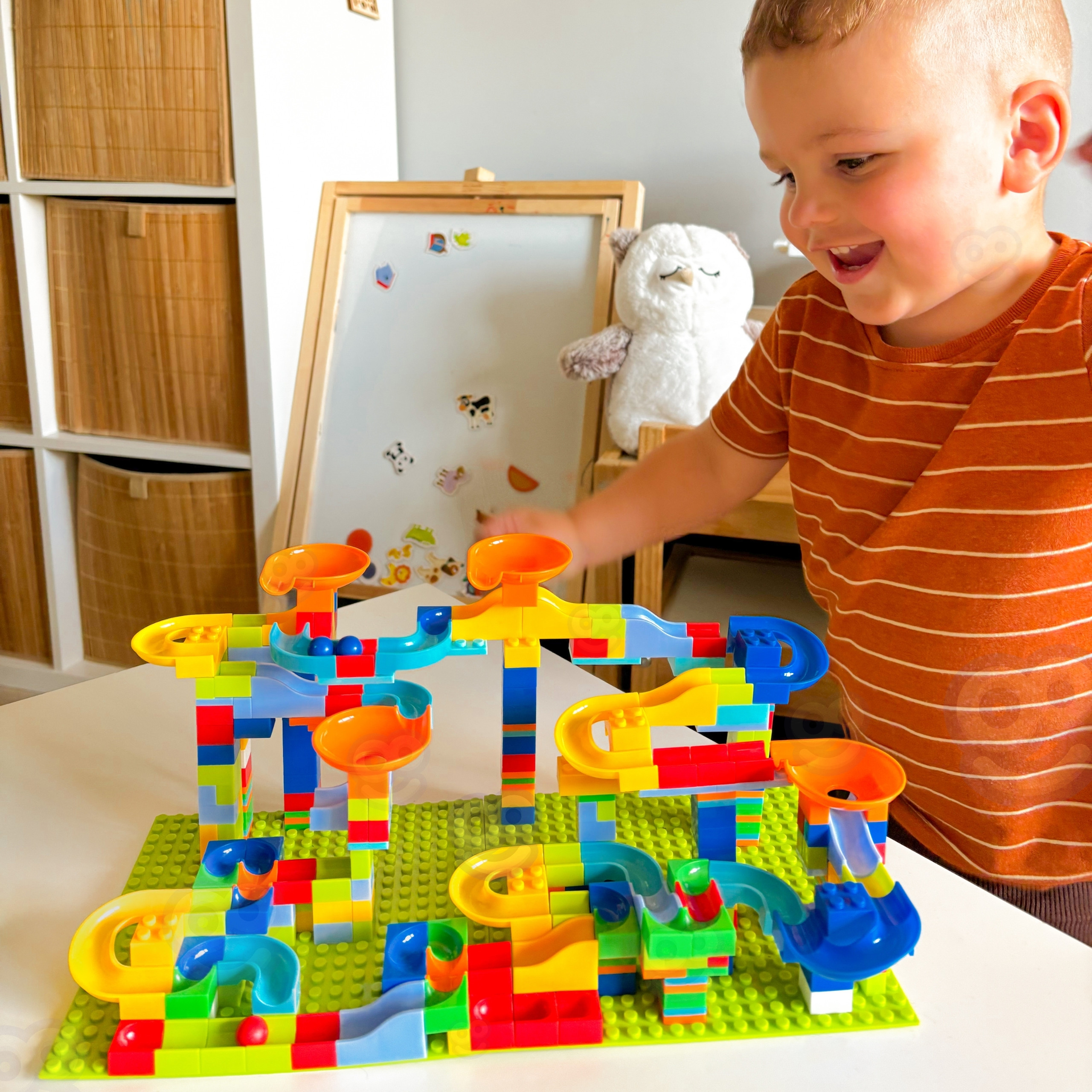 Woopie Blocks Set – tai įspūdingas konstruktorius, leidžiantis vaikui tapti tikru architektu ir sukurti savo milžinišką rutuliukų trasą. Rinkinyje yra net 340 elementų, todėl galimybių kurti skirtingas konstrukcijas praktiškai nėra ribų. Vaikas gali statyti aukštas bokštų sistemas, vingiuotas trasas, greičio nuokalnes ir sudėtingus posūkius, kurie suteikia rutuliukams pagreitį ir sukuria tikrą veiksmo kupiną žaidimą.
