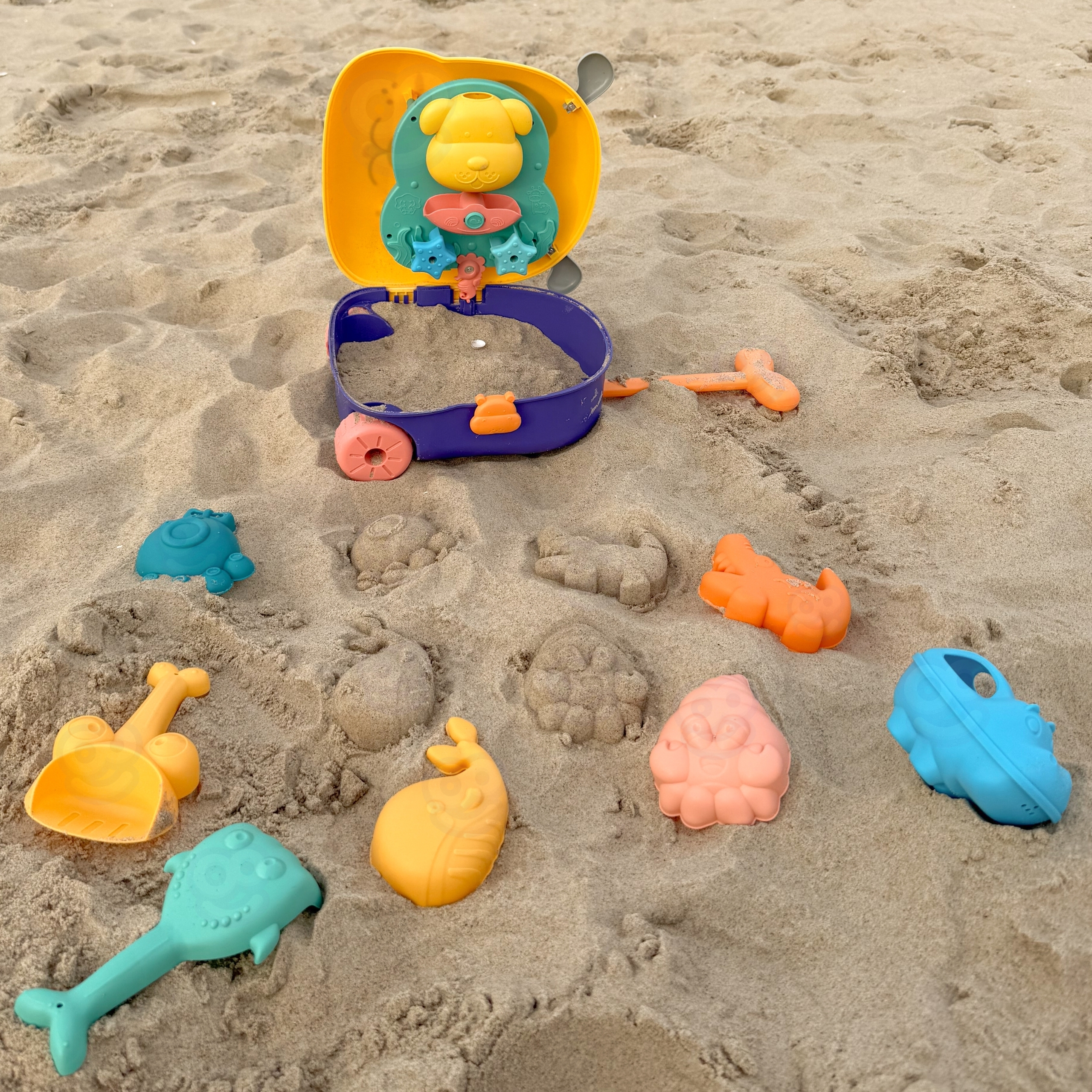 Lagaminą tereikia paguldyti, pripildyti dugną vandeniu, o tada su puodeliu pilti vandenį į viršutinę dalį ir stebėti, kaip jis teka žemyn. Tai ramina, lavina sensoriką ir padeda vaikui susikoncentruoti. Smėlio įrankiai ir formelės leidžia žaisti net dviem vaikams vienu metu.