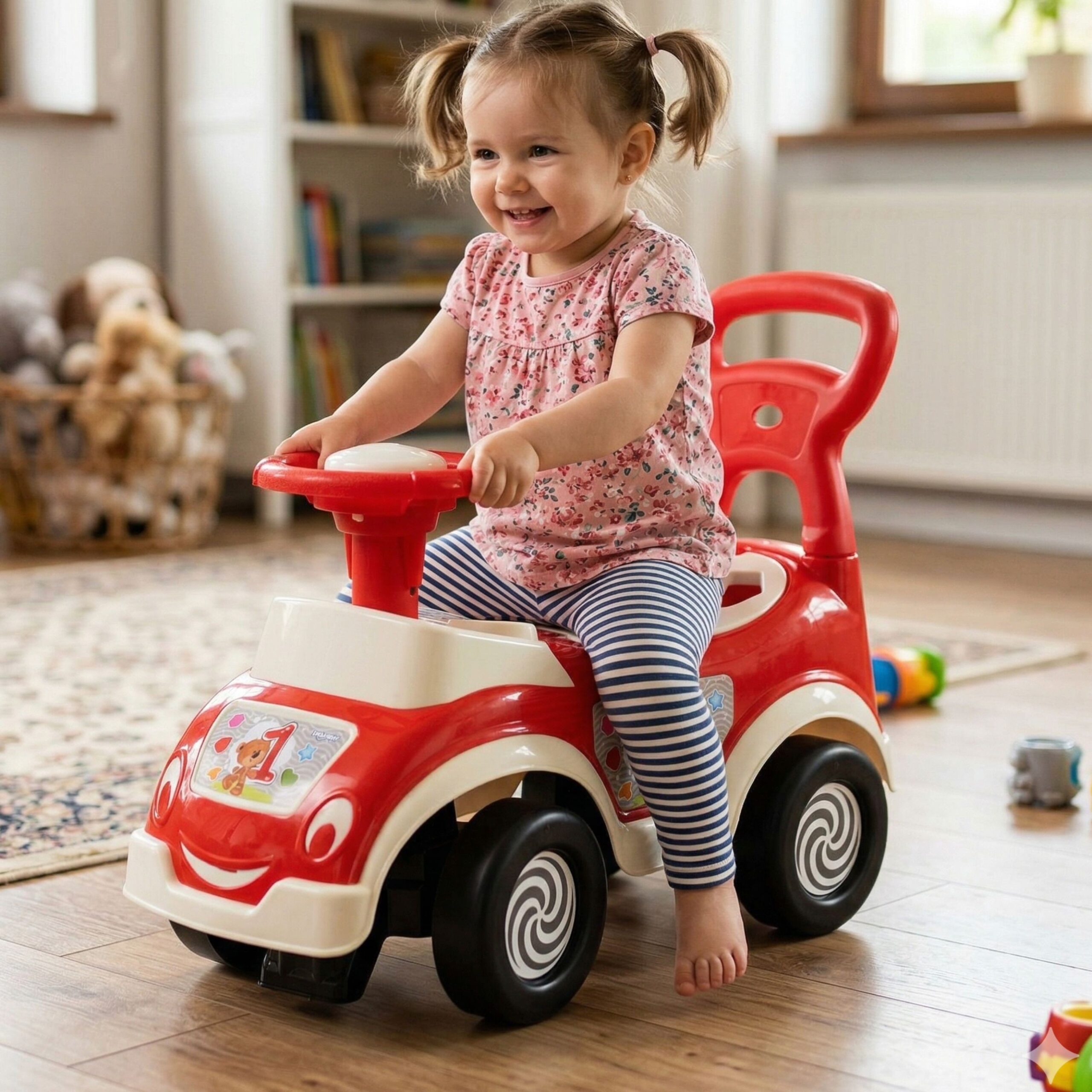 Žaislas turi slapta daiktų talpyklą, puikiai tinkamą paslėpti ar pasiimti žaislus bei lobius. Garsinis signalas (ragelis) suteikia papildomo džiaugsmo vaikui. Galinė rankena ir vairas yra minkšti liesti, kad vaikas jaustųsi patogiai. Šis žaislas puikiai tinka ankstyvam vystymuisi.
