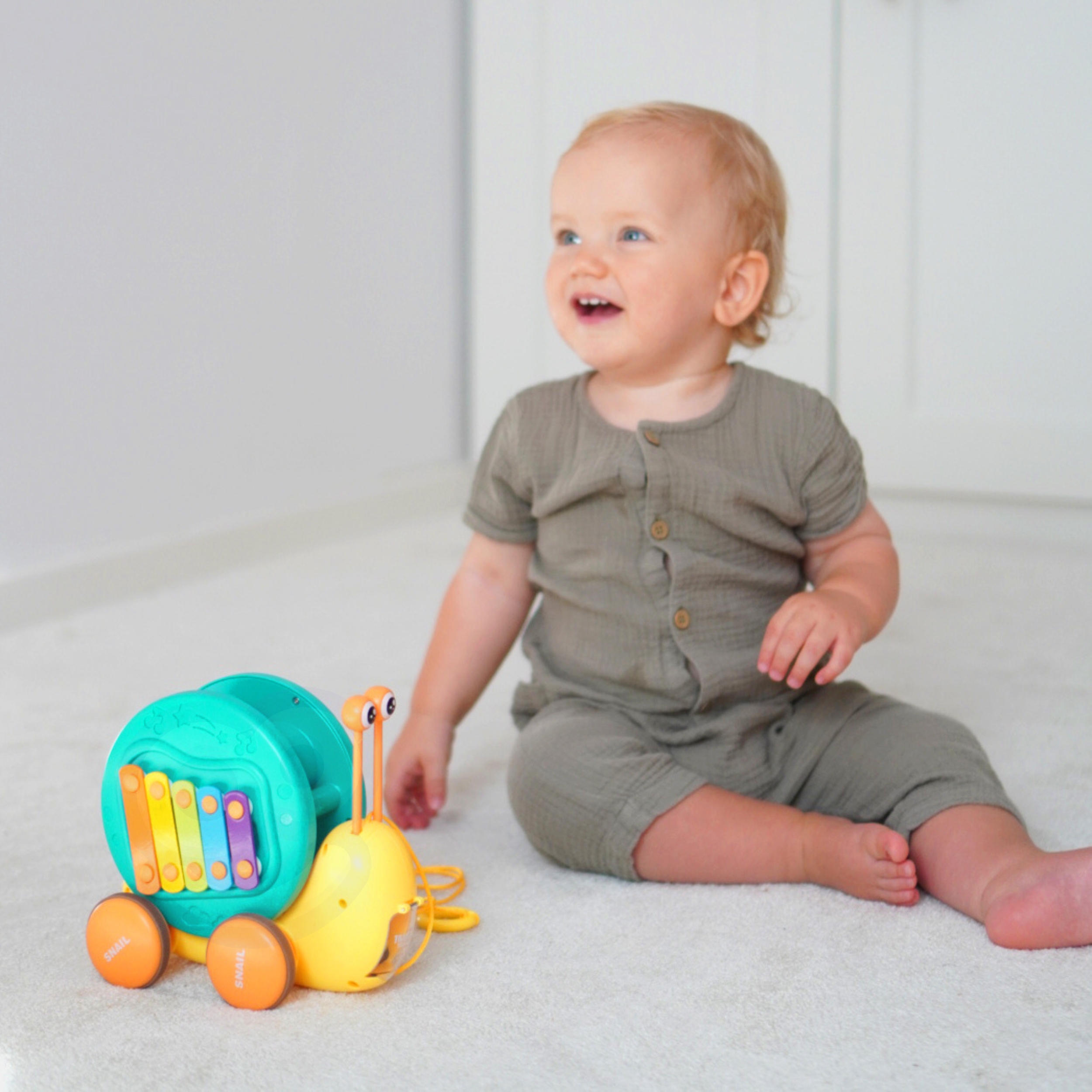 Daugiafunkcis WOOPIE žaislas-sraigė stumiama , kuris patraukia vaikų dėmesį ir stimuliuoja jų vaizduotę. Ryškios spalvos taip pat lavina jų regimąjį suvokimą ir estetinį pojūtį. Žaislas-sraigė siūlo įvairius žaidimo ir mokymosi būdus. Galite spausti klavišus , kad lavintų vaikų klausą ir akių bei rankų koordinaciją . Taip pat galite traukti sraigę už pavadėlio arba stumti ją ir leisti jai slysti grindimis, o tai padidina linksmybes ir iššūkį. Žaisdami vaikai mokosi apie gyvūnus, muziką ir priežasties bei pasekmės ryšius. Tai skatina stebėjimą, loginį mąstymą ir fizinę koordinaciją , o jūsų vaikas gali mėgautis valandų valandas kūrybiško žaidimo. Žaislas-sraigė traukiama – puikus būdas praleisti laiką su vaikais. Mamos gali žaisti su savo mažyliais ir stebėti, kaip jie kikena, kai sraigė juda. Šis žaislas tinka šeimos sąveikai ir gali sustiprinti abipusius jausmus . Žaislas susideda iš dviejų dalių: sraigės kiauto, kuriame yra cimbolai, ir akies formos lazdelių (esančių kiauto viduje). Antroji dalis yra mažo sraigės automobiliuko paleidimo įrenginys . Žaislo gale yra mygtukas, kuris atidaro automobilio paleidimo įrenginį.