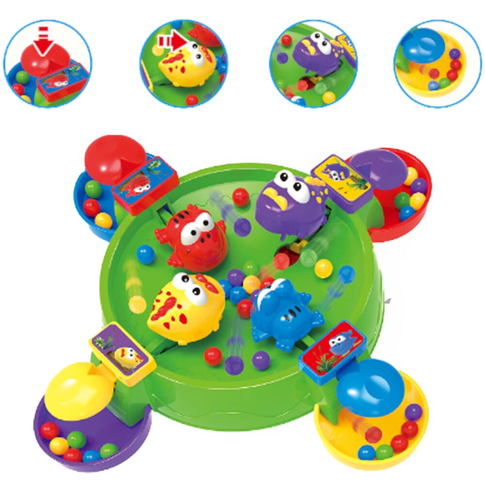 „Woopie “ prekės ženklo arkadinis žaidimas „Hungry Frogs“ – tai spalvingas, dinamiškas žaidimas vaikams, lavinantis rankų miklumą, refleksus ir akių bei rankų koordinaciją. Paprastos taisyklės, dinamiškas žaidimo būdas ir spalvingas dizainas neleidžia žaidimui atsistoti ant žemės! Tikslas – pamaitinti savo personažą kuo daugiau spalvotų kamuoliukų. Kiekvienas žaidėjas turi savo figūrėlę, kurią valdo specialiu mygtuku. Paspaudus mygtuką, įjungiamas mechanizmas, kuris „suvalgo“ kamuoliukus. Greitis ir refleksai yra pergalės raktas! Laimi tas, kuris surenka daugiausiai kamuoliukų į savo konteinerį. Žaidimą galima žaisti vienam, dviese arba iki keturių žaidėjų – idealiai tinka dalintis su broliais ir seserimis, tėvais ar draugais. Tai puikus šeimos ar socialinis žaidimas, kuris suteiks vaikams daug juoko ir varžybų jaudulio.
