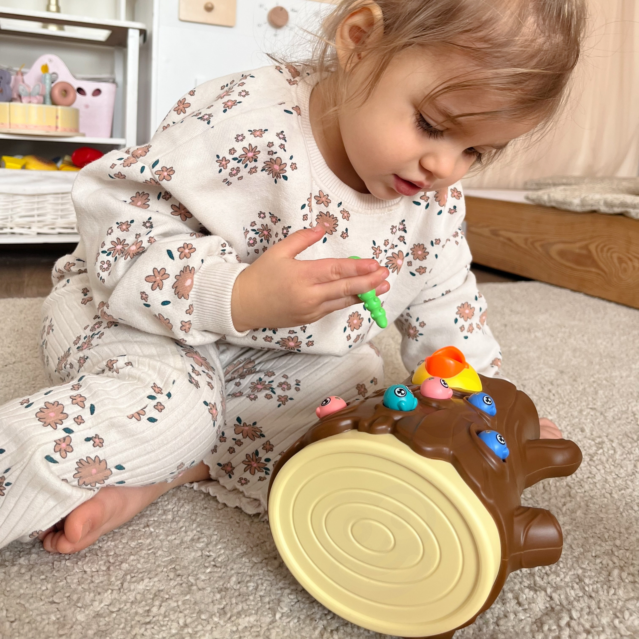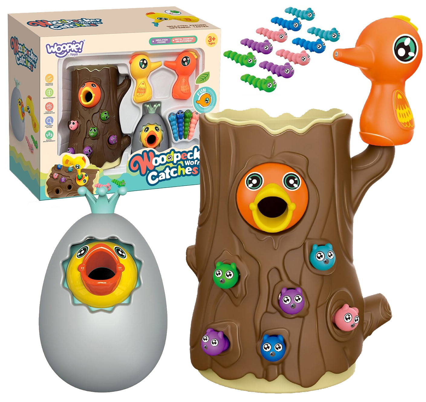 Woopie „Pagauk vabaliuką“ įgūdžių žaidimas yra įtraukiantis ir smagus žaidimas kiekvienam mažyliui. Vaikai tampa paukščio mama ar tėčiu ir maitina alkaną jauniklį naudodami magnetinį genio snapą. Užduotis – atsargiai ištraukti spalvotus vabaliukus, paslėptus medžio kamiene, ir nunešti juos prie mažojo paukštelio snapo. Komplekte taip pat yra kiaušinis, kuris veikia kaip taupyklė ir smagus svyruojantis žaislas. Žaidimas garantuoja daug juoko ir puikiai lavina mažas rankytes. Integruoti saugūs magnetai leidžia lengvai „pagauti“ vabaliukus, tačiau reikalauja vaiko susikaupimo. Šis produktas skirtas ugdyti kantrybę ir tikslumą. Po žaidimo visi vabaliukai gali būti lengvai išpilami iš kamieno ir žaidimą galima pradėti iš naujo.