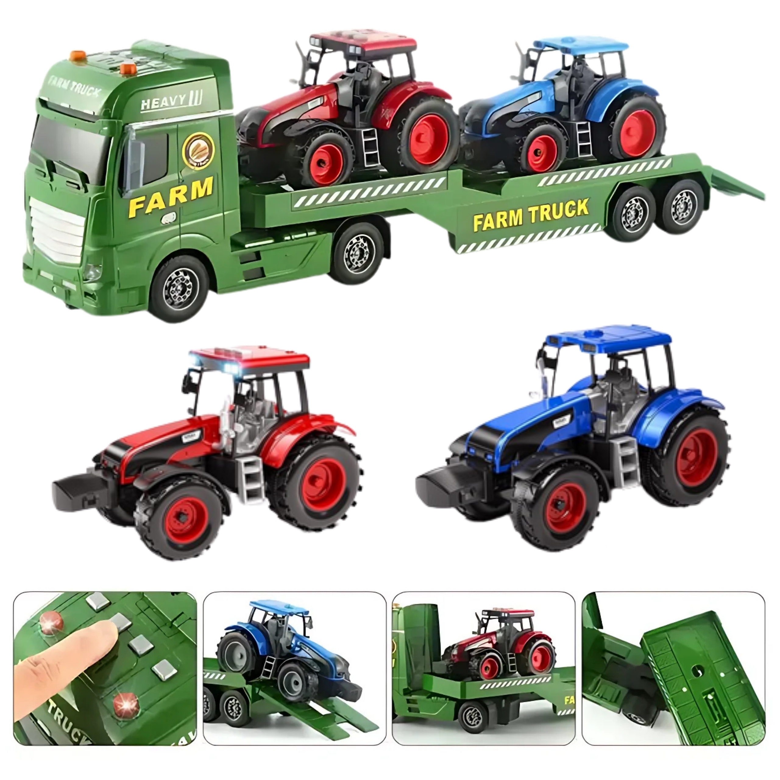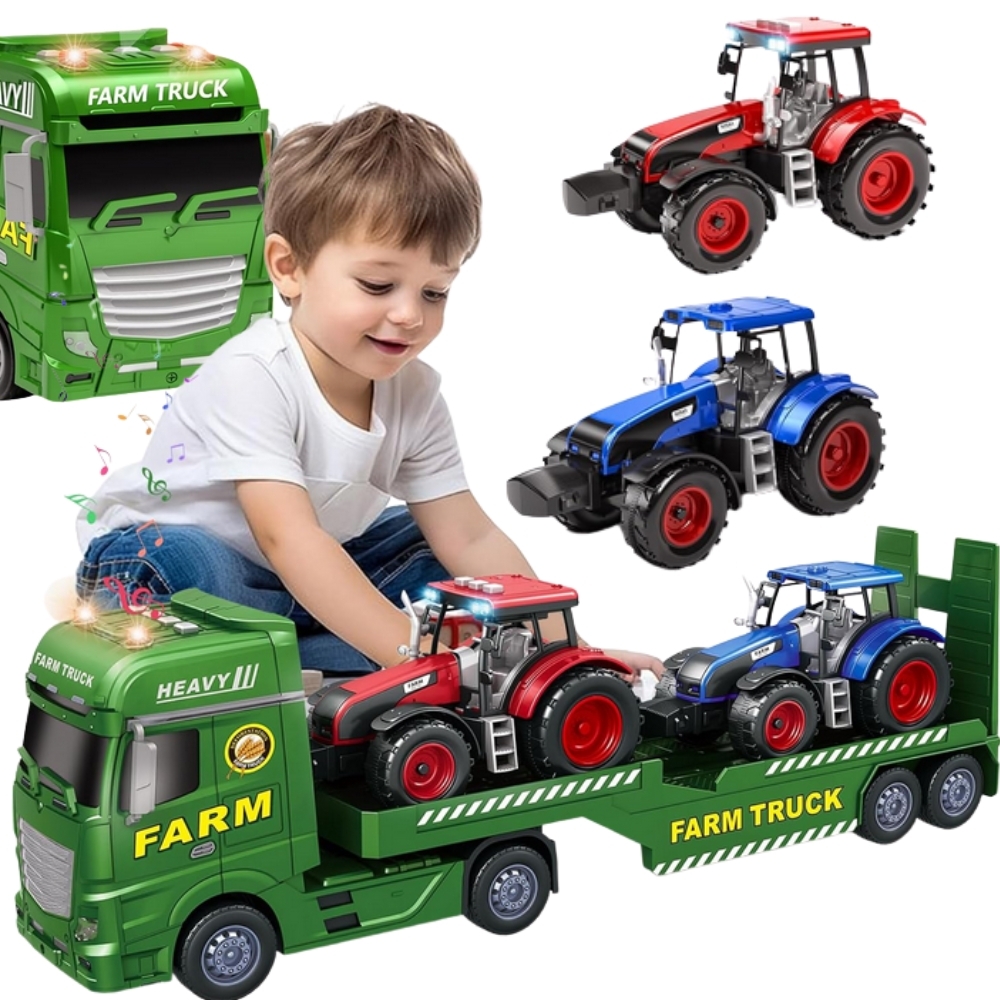 Žemės ūkio komplektas su vilkiku ir traktoriais tai unikalus pasiūlymas kiekvienam mažam žemės ūkio ir transporto priemonių gerbėjui. Dėl didelio masto ir tvirtos konstrukcijos žaislas puikiai tinka tiek žaidžiant namuose, tiek lauke. Kiekviena transporto priemonė buvo kruopščiai suprojektuota, atkreipiant dėmesį į detales ir savybes, dėl kurių linksmybės yra išskirtinai tikroviškos. Sunkvežimis su vilkiko funkcija komplektuojamas su: kilnojama pakrovimo rampa, kuri leidžia savarankiškai pakrauti ir iškrauti transporto priemones. Rampą galima lengvai nuleisti ir pakelti, todėl galima sukurti tikroviškas transporto scenas. Vilkikas ir vienas traktorius buvo aprūpinti: apšvietimas ir garso efektai – paspaudus atitinkamus mygtukus, vaikas išgirs tikroviškus vairavimo garsus, garso signalo garsus ir darbo signalus, o salone esantys žibintai pradeda šviesti, o tai žymiai padidina rinkinio patrauklumą. Šis rinkinys puikiai tinka ne tik namuose, bet ir lauke. –, vaikas gali susikurti savo ūkį, transporto įrangą ir sugalvoti žaidimo scenarijus. Rinkinys ne tik suteikia didžiulį kiekį pramogų, bet ir jis ugdo rankinius įgūdžius, loginį mąstymą, kūrybiškumą ir akių ir rankų koordinaciją„.Tvirta konstrukcija ir estetinis apdirbimas daro šį gaminį idealia idėja gimtadienio ar šventinei dovanai.