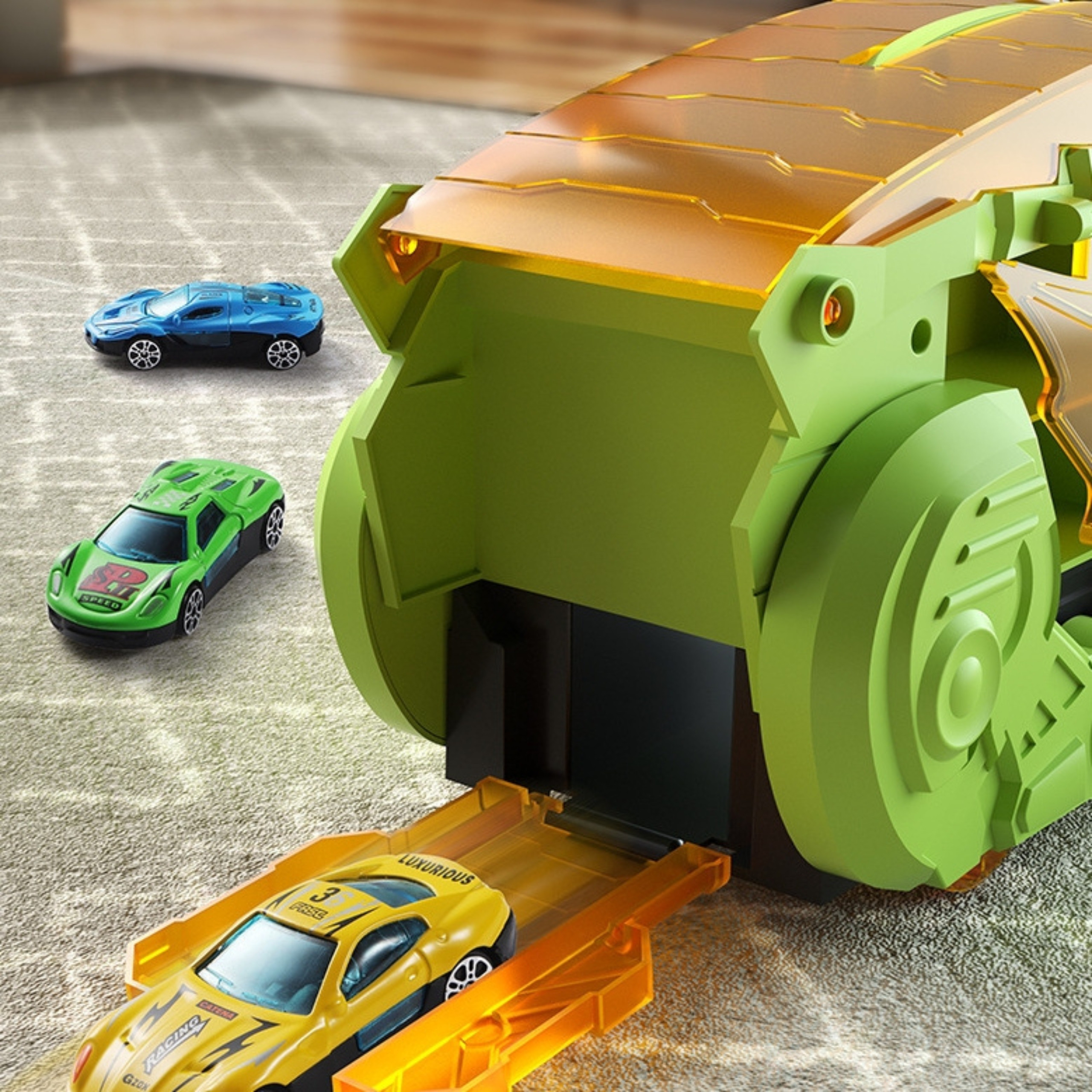 Išskleidus žaislą, jis tampa lenktynių trasa, kurioje gali varžytis komplekte esančios 12 mašinėlių. Judantys elementai – atsidaranti dinozauro burna, judančios letenos, nuleidžiama rampa – suteikia dar daugiau įtraukiančio žaidimo ir lavina vaikų motoriką bei vaizduotę.