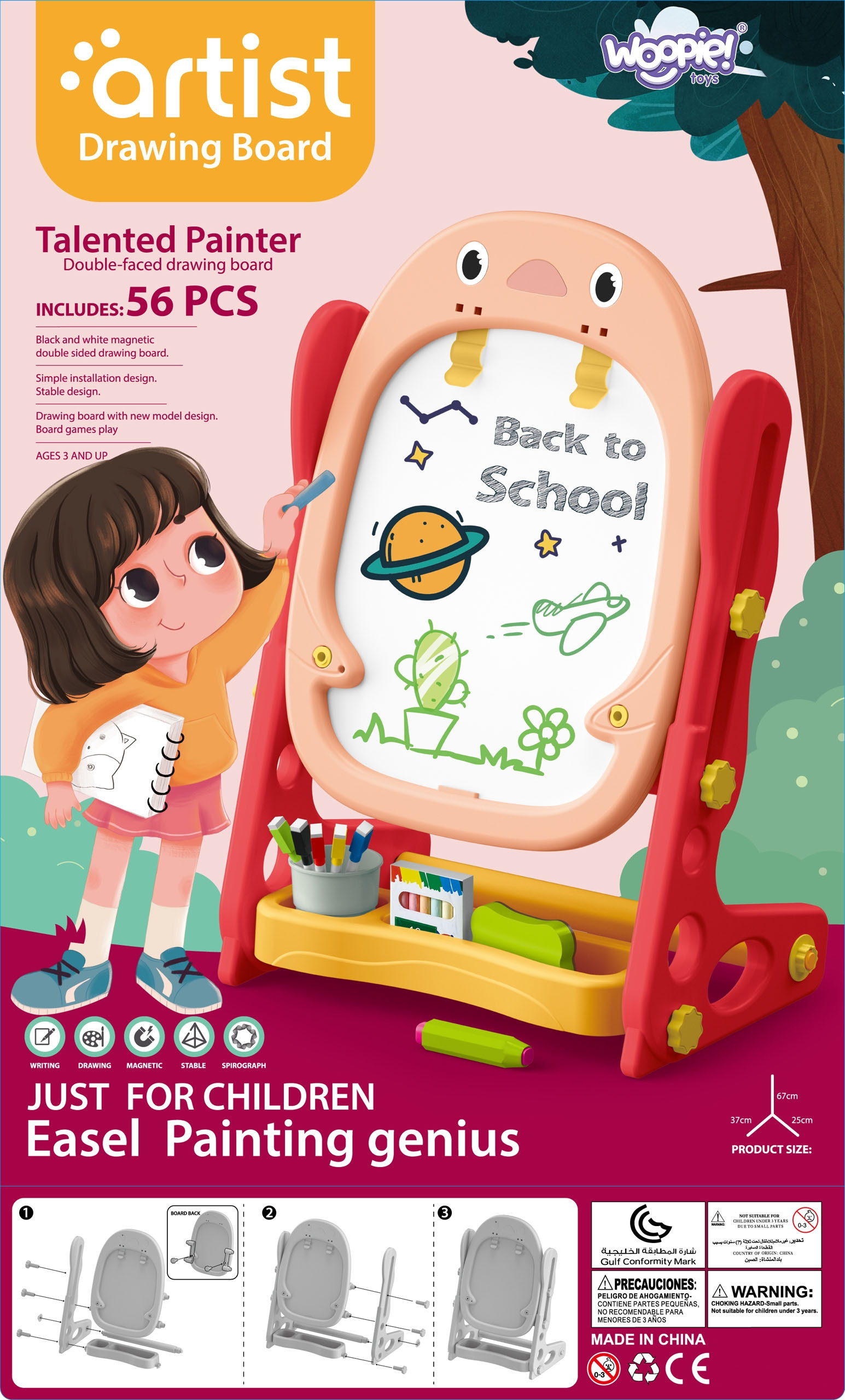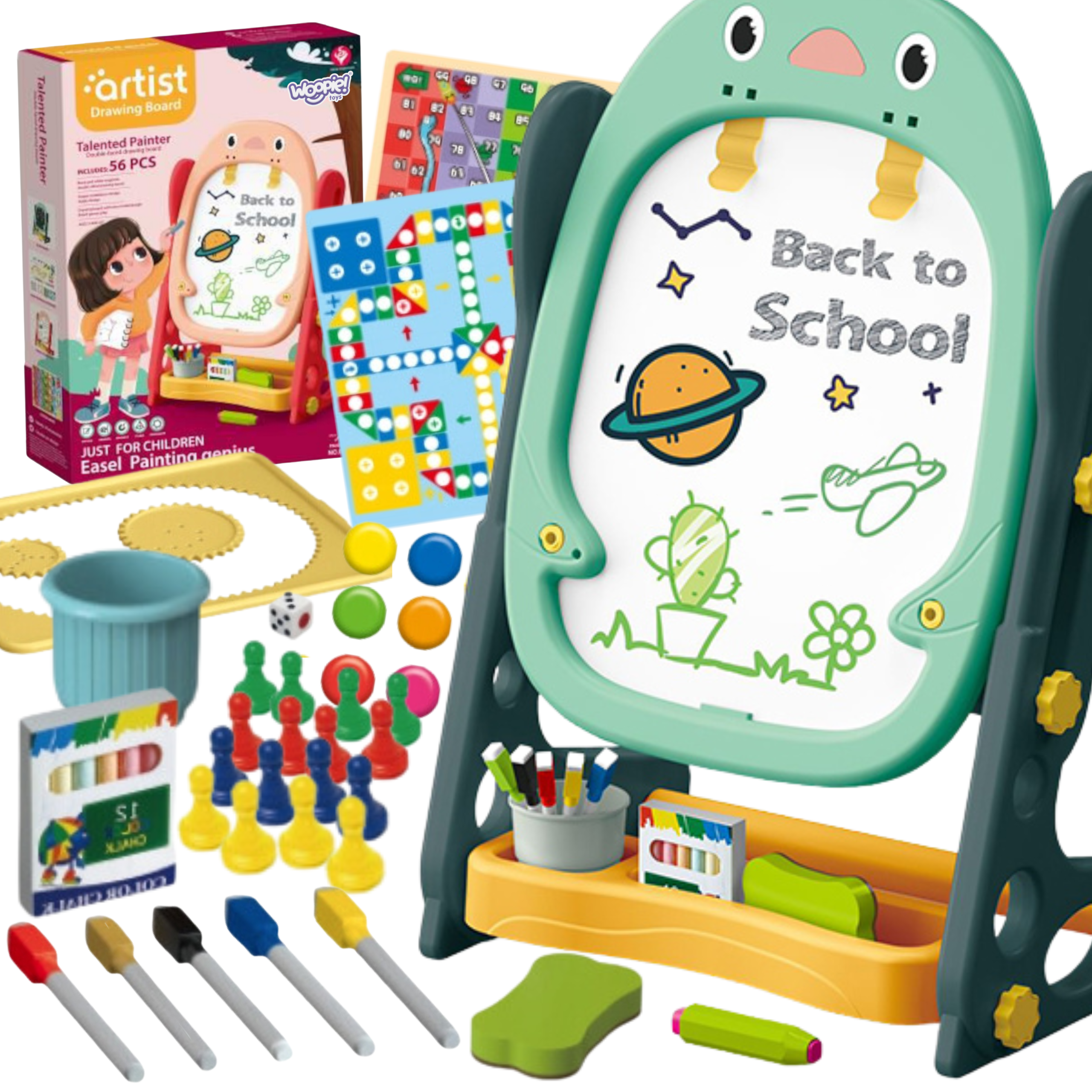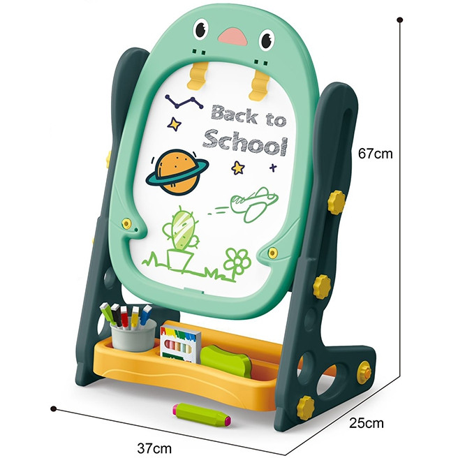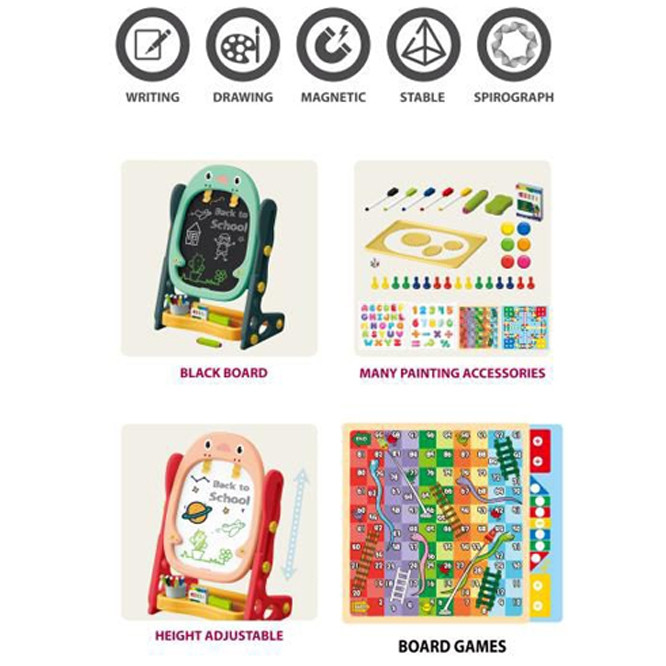 WOOPIE dvipusė magnetinė piešimo lenta – universalus įrankis mokymuisi ir meninių įgūdžių lavinimui. Rinkinys apima visus reikalingus priedus, leidžiančius įvairiai naudoti lentą. Lenta lengvai surenkama ir turi aukščio reguliavimo galimybę, todėl ją galima pritaikyti bet kuriam vaikui. Šis žaislas yra svarbus kasdieniam vaiko vystymuisi.
