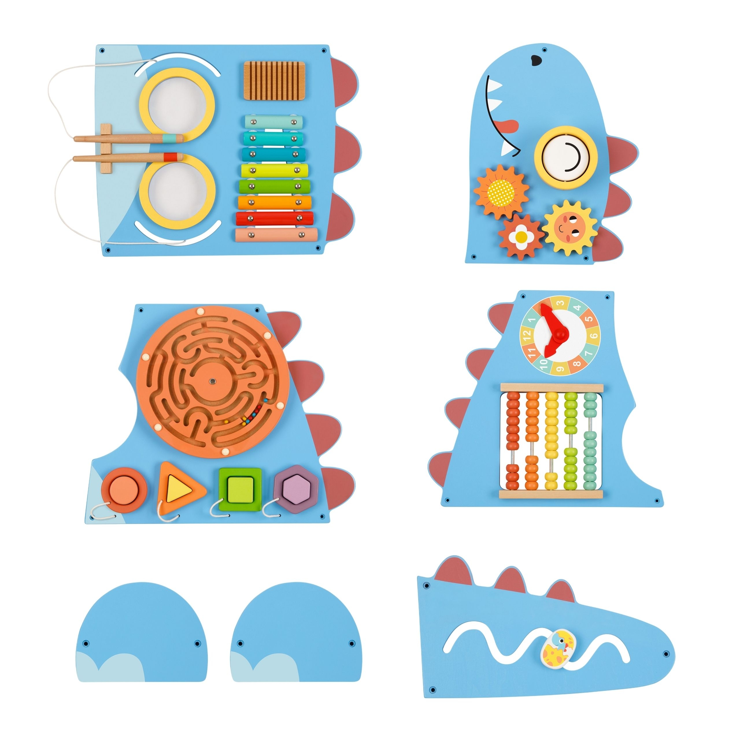 Atraskite stebuklingą dinozaurų pasaulį kartu su edukaciniu nuotykiu! Ši unikali medinė mielo dinozauro formos veiklos lenta yra tikras pramogų centras mažiesiems tyrinėtojams. Šešios skirtingos plokštės siūlo daugybę veiklų, kurios sugers vaiko dėmesį valandų valandas, kartu lavindamos pagrindinius įgūdžius. Kiekvienas elementas buvo apgalvotai sukurtas taip, kad paskatintų pažintinį smalsumą ir suteiktų savęs atradimo džiaugsmą.