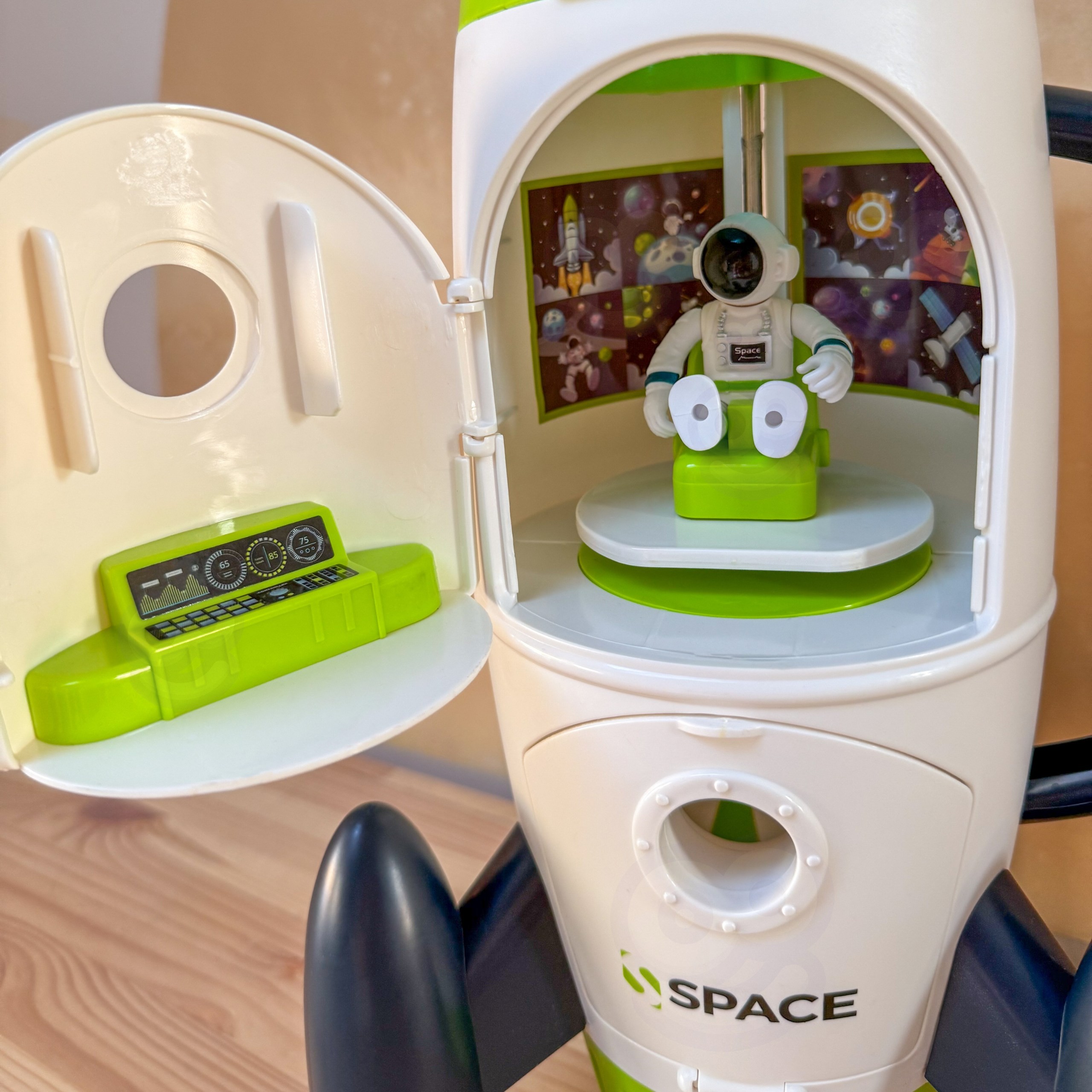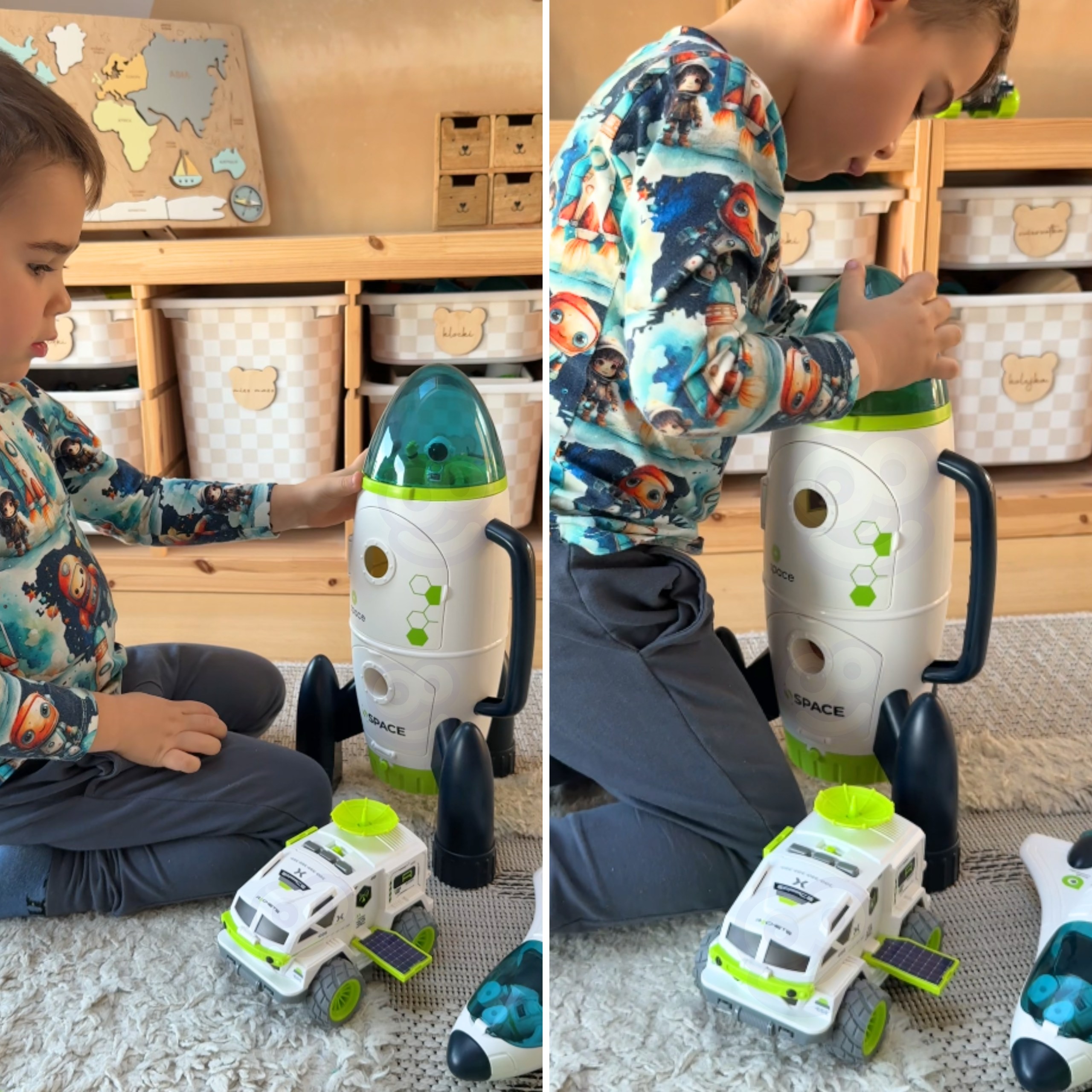 Produktas susideda iš kelių interaktyvių elementų, kiekvienas turi skirtingas funkcijas. Astronauto figūrėlę galima pastatyti į besisukančią sėdynę viršutinėje kapsulėje, o vėliau nuleisti į raketos apatinę dalį, kur laukia kosminis roveris, pasiruošęs važiuoti. Skaičiavimo atgal garso efektas ir šviečianti bazė suteikia dar daugiau realistiškumo ir įspūdžio. Puikiai tinka žaisti namuose, darželyje, sode ar paplūdimyje. Dėl patogios rankenos vaikai gali lengvai nešti raketą ir tęsti kosmines misijas bet kur, kur juos nuves vaizduotė. Taip pat puiki priemonė šeimos piknikams – vaikai gali pasiimti raketą lauke, dalintis linksmybėmis su broliais, seserimis ar draugais ir patirti nuotykius bet kur! Kiekvienas rinkinio elementas sukurtas atsižvelgiant į vaikų saugumą, kokybę ir lavinimą. Šis žaislas ne tik suteikia daug pramogų, bet ir skatina logišką mąstymą, motoriką bei kūrybiškumą. Tobula dovana kiekvienam kosmoso mylėtojui!