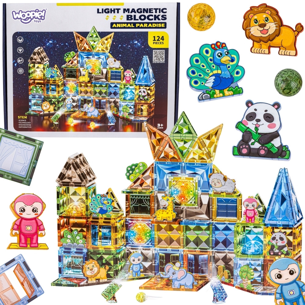 WOOPIE Magnetinės konstravimo kaladėlės „Šviečiantis 3D gyvūnų pasaulis“, 124 vnt.