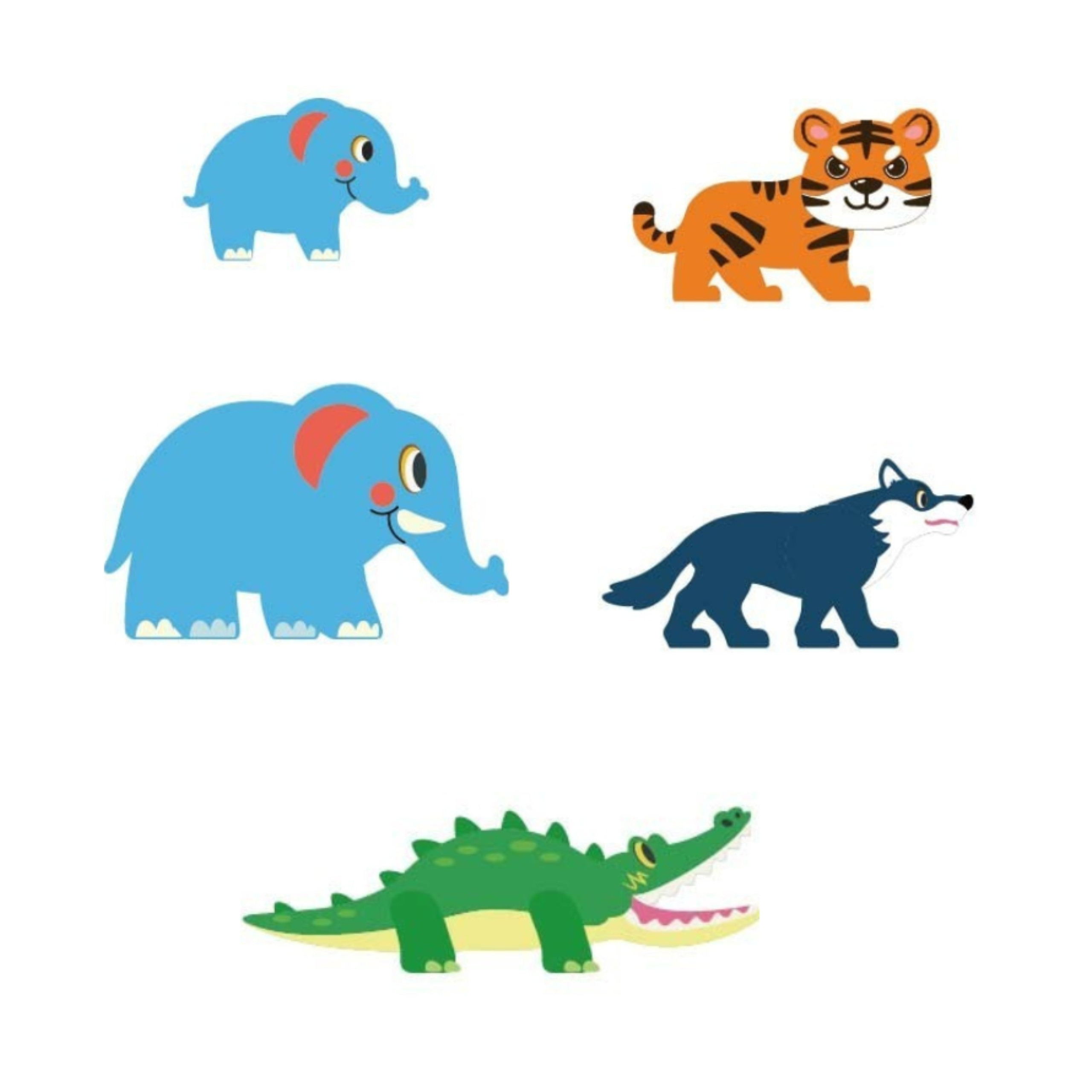 Gyvūnų figūrėlės: 2 × dramblys, tigras, krokodilas, vilkas.