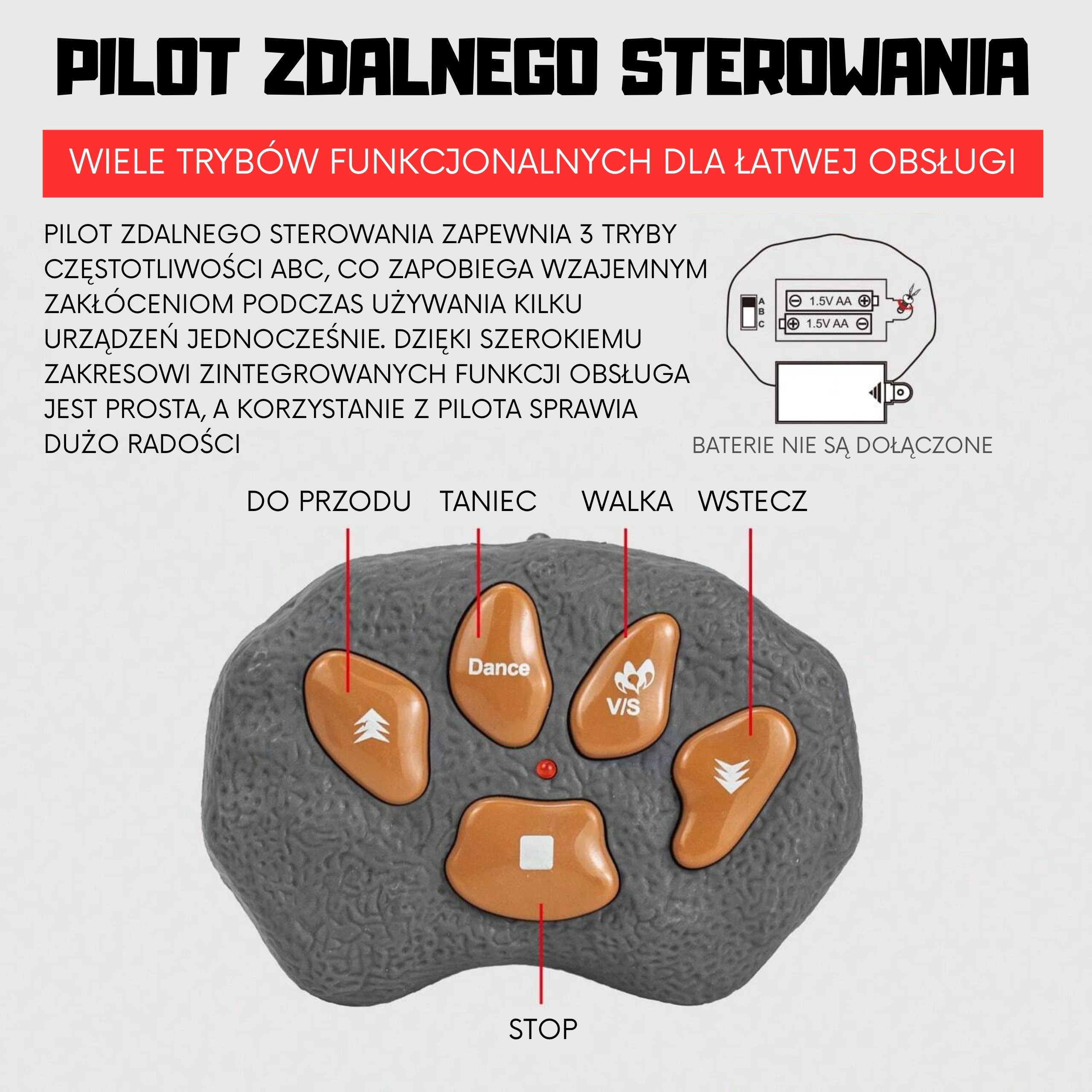– Dinozaurui ir nuotolinio valdymo pultui reikalingos 5 x 1,5 V AA baterijos (nepridedamos)