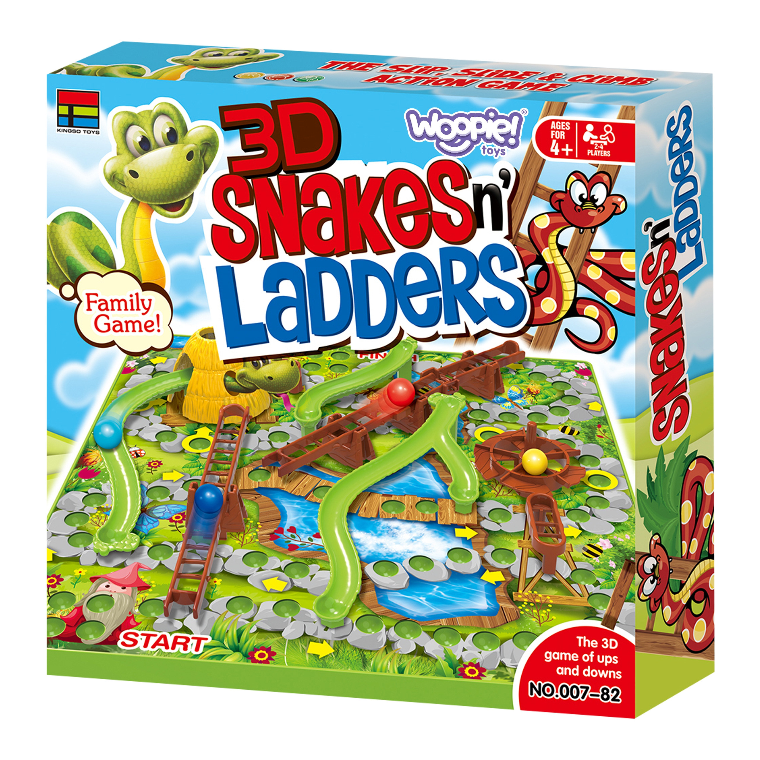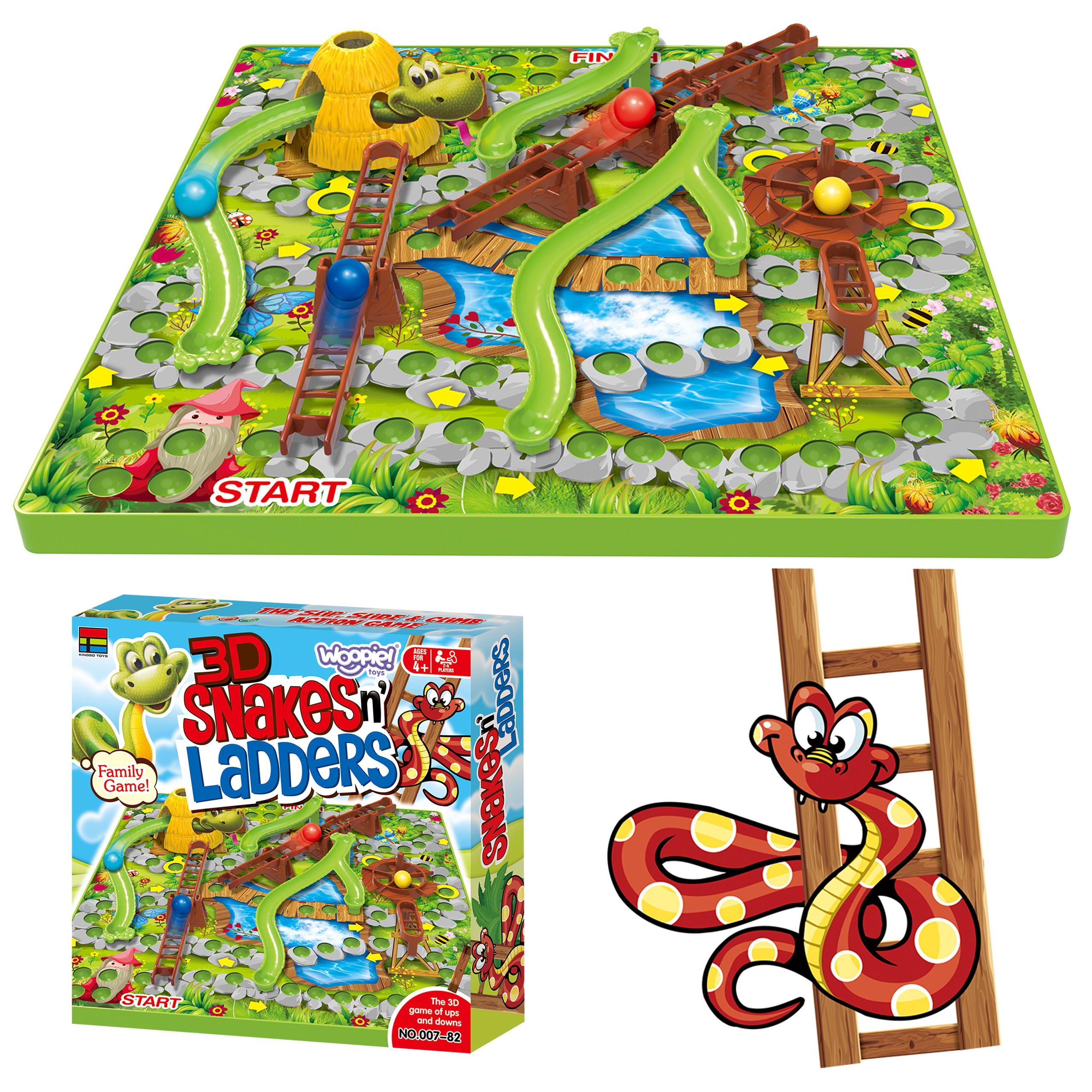 „Laiptai ir gyvatės“ – populiarus ir nuostabus žaidimas vaikams. Rinkinyje yra lenta, ant kurios juda specialūs kamuoliukai. Kiekvienas žaidėjas turi kamuoliuką skirtingos spalvos. Metus kauliuką, žaidėjas juda tiek laukelių, kiek iškrito skaičius. Kai kamuoliukas sustoja ant specialaus laukelio, jis gali pajudėti pirmyn naudodamas kopėčias arba nusileisti žemyn, jei pataiko ant gyvatės. Lenta yra 3D, todėl sustojus ant specialaus laukelio, kamuoliukas juda aplink lentą. Žaidimas puikiai tinka šeimos vakarams ir lavina vaiko protą, rankų ir akių koordinaciją bei loginį mąstymą.