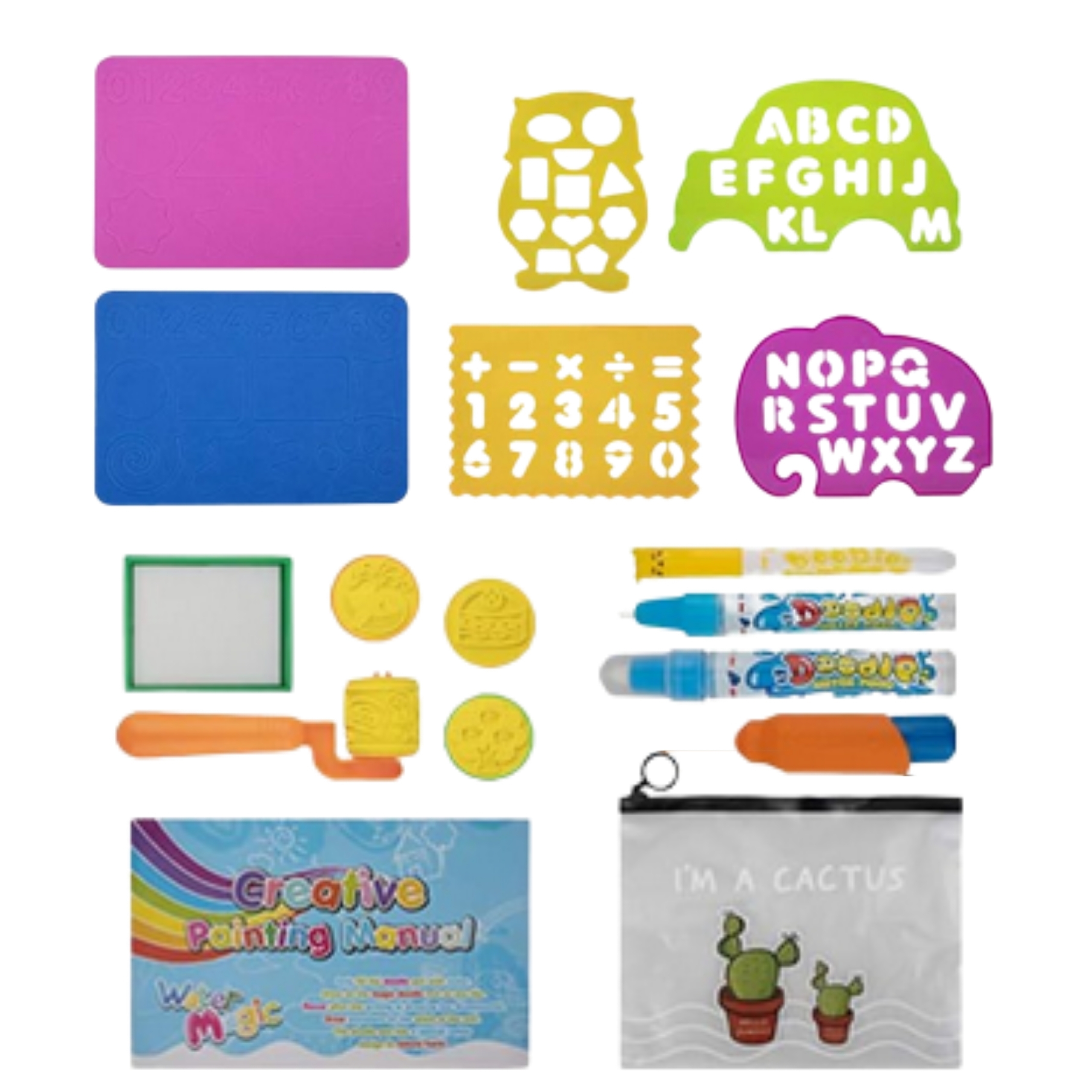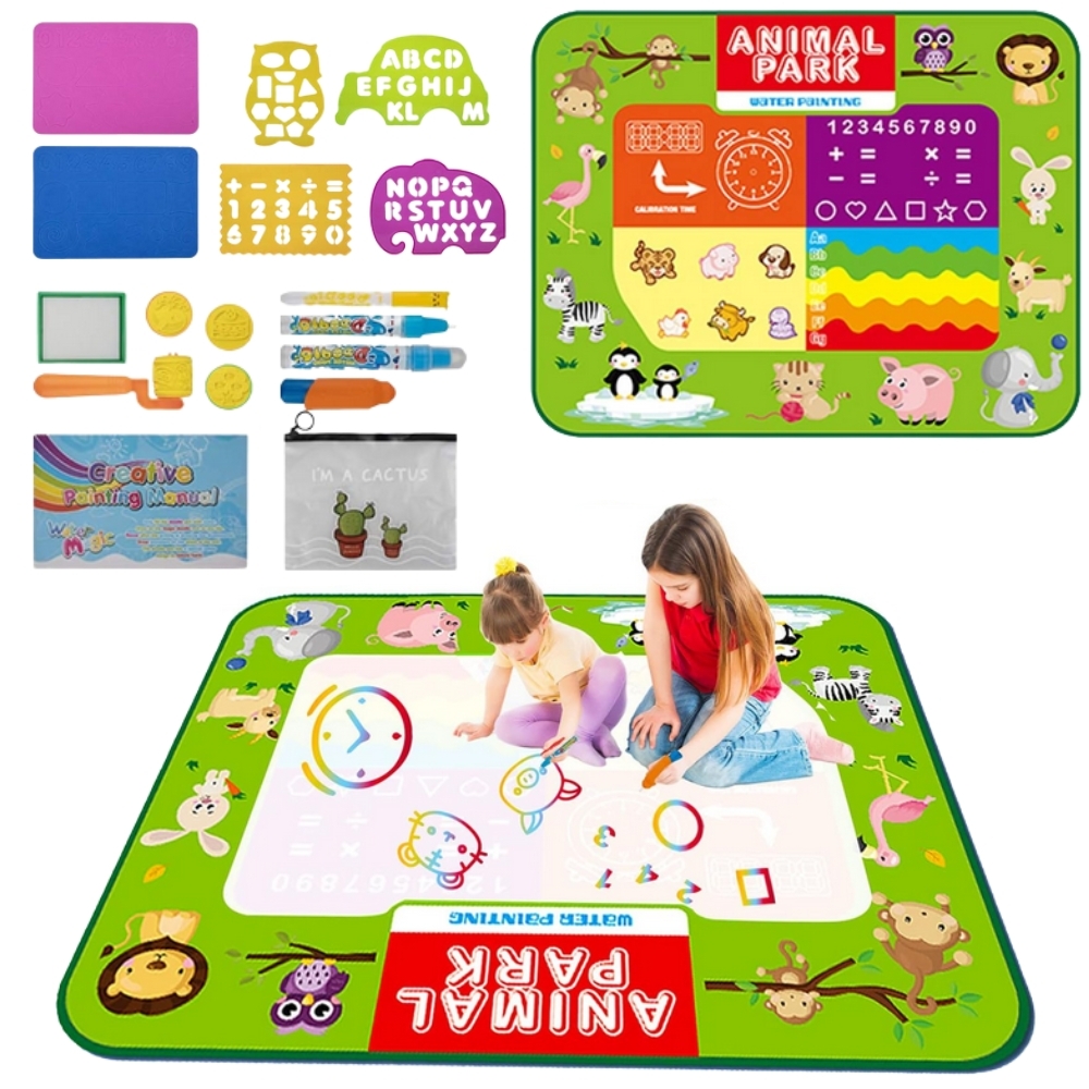 Štai nepaprasta gyvūnų parko mokomasis vandens kilimėlis markės Woopie – spalvinga, saugi ir nuotykių kupina erdvė, sukurta jauniausiems tyrinėtojams! Ačiū kūdikių komplektui jis mokosi žaisdamas – mokosi abėcėlės, skaičių, formų, analogiško laikrodžio, gyvūnų. Vėlesniame etape taip pat galite mokytis anglų kalba. Pridedami priedai, pvz vandens rašikliai, volelis, antspaudai ir trafaretai, leiskite dažyti be dėmių ir netvarkos –, viskas, ko jums reikia, yra vanduo! Produktas yra daugkartinio naudojimo – po džiovinimo kilimėlis yra paruoštas tolesniems kūrybiniams užsiėmimams po kelių minučių. Puikiai tinka žaisti solo arba su broliais ir seserimis, draugais ar tėvais. Kilimėlis pagerina rankinius įgūdžius, rankų ir akių koordinaciją ir yra puikus būdas mokytis žaidžiant. Jis gali būti naudojamas tiek namuose, tiek sode.