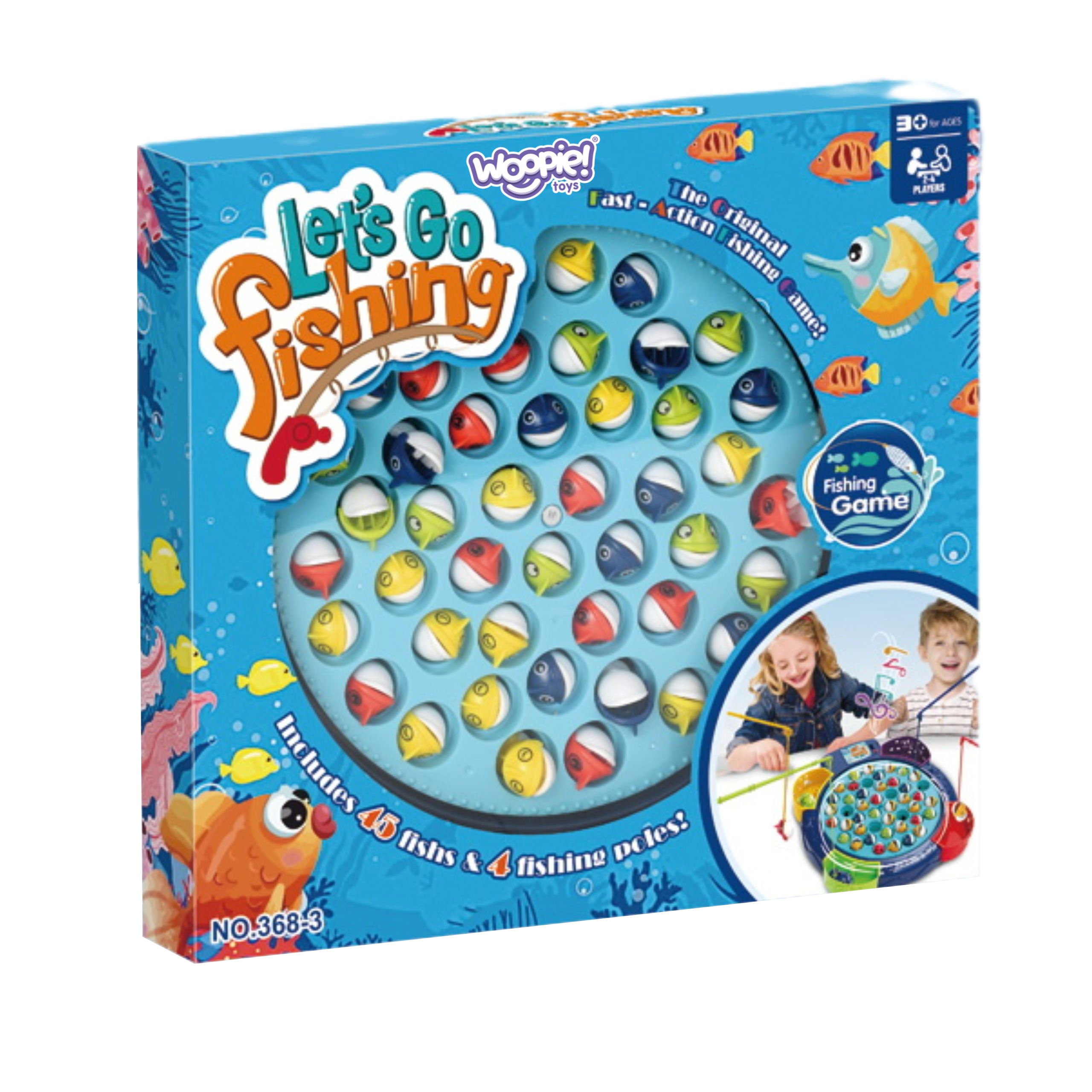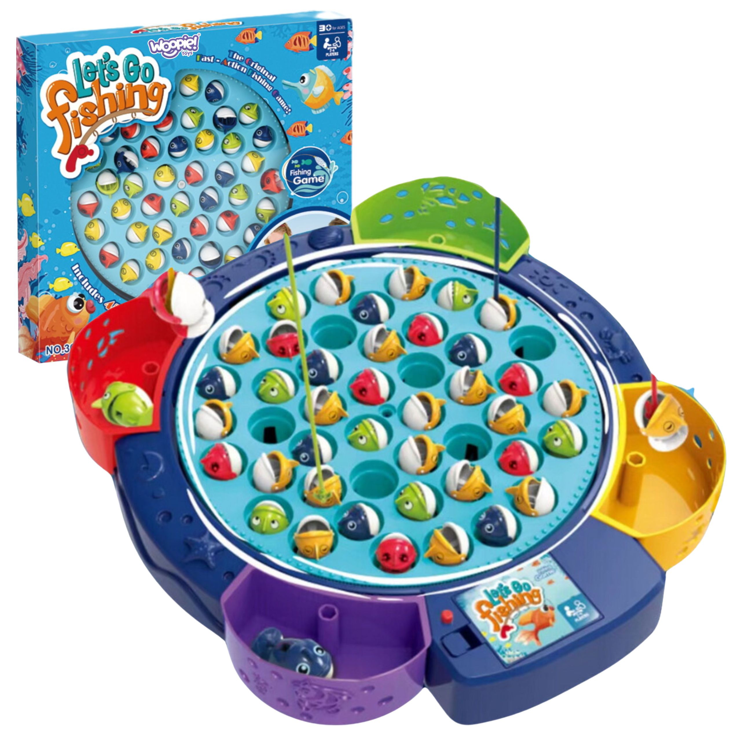 Žvejybos žaidimas „WOOPIE“ – puiki pramoga visai šeimai! Žvejyba suteiks valandų valandas įspūdžių ir linksmybių. Pradėkite! Pasirinkite mėgstamą meškerės spalvą ir įjunkite žaislą. Baseinai pradės suktis, o kartu su jais – ir žuvys. Periodiškai kiekviena žuvis išnyra iš vandens – greitai ją pagaukite savo meškere! Laimi tas, kuris pagauna daugiausiai žuvų – o kartais tai nemenkas žygdarbis…