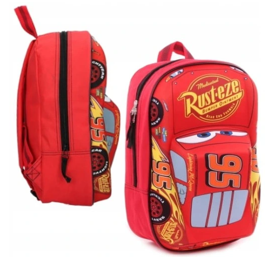 Kuprinė yra raudonos spalvos, o priekyje yra trimatis automobilio stogo formos spaudinys, vaizduojantis populiarų personažą Žaibą Makvyną iš filmo „Ratai“.